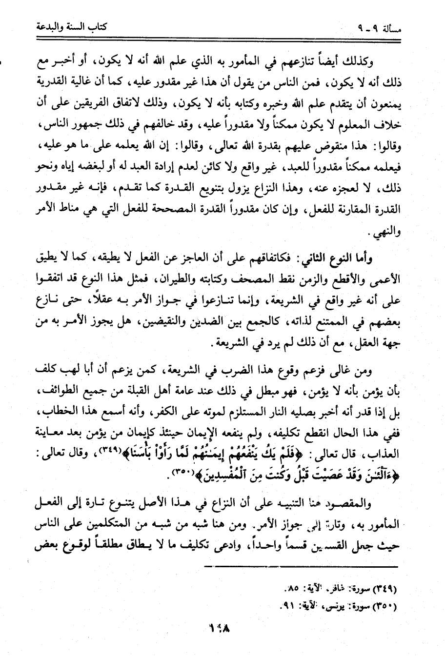 وَكَذَلِكَ أَيْضًا تَنَازُعُهُمْ فِي الْمَأْمُورِ بِهِ الَّذِي عَلِمَ اللَّهُ أَنَّهُ لَا يَكُونُ، أَوْ أَخْبَرَ مَعَ ذَلِكَ أَنَّهُ لَا يَكُونُ، فَمِنْ النَّاسِ مَنْ يَقُولُ إنَّ هَذَا غَيْرُ مَقْدُورٍ عَلَيْهِ، كَمَا أَنَّ غَالِيَةَ الْقَدَرِيَّةِ يَمْنَعُونَ أَنْ يَتَقَدَّمَ عِلْمُ اللَّهِ وَخَبَرُهُ وَكِتَابُهُ بِأَنَّهُ لَا يَكُونُ، وَذَلِكَ لِاتِّفَاقِ الْفَرِيقَيْنِ عَلَى أَنَّ خِلَافَ الْمَعْلُومِ لَا يَكُونُ مُمْكِنًا وَلَا مَقْدُورًا عَلَيْهِ، وَقَدْ خَالَفَهُمْ فِي ذَلِكَ جُمْهُورُ النَّاسِ، وَقَالُوا: هَذَا مَنْقُوضٌ عَلَيْهِمْ بِقُدْرَةِ اللَّهِ تَعَالَى، وَقَالُوا: إنَّ اللَّهَ يَعْلَمُهُ عَلَى مَا هُوَ عَلَيْهِ، فَيَعْلَمُهُ مُمْكِنًا مَقْدُورًا لِلْعَبْدِ، غَيْرَ وَاقِعٍ وَلَا كَائِنٍ لِعَدَمِ إرَادَةِ الْعَبْدِ لَهُ أَوْ لِبُغْضِهِ إيَّاهُ وَنَحْوِ ذَلِكَ، لَا لِعَجْزِهِ عَنْهُ، وَهَذَا النِّزَاعُ يَزُولُ بِتَنْوِيعِ الْقُدْرَةِ كَمَا تَقَدَّمَ، فَإِنَّهُ غَيْرُ مَقْدُورِ الْقُدْرَةِ الْمُقَارِنَةِ لِلْفِعْلِ، وَإِنْ كَانَ مَقْدُورًا الْقُدْرَةَ الْمُصَحِّحَةَ لِلْفِعْلِ الَّتِي هِيَ مَنَاطُ الْأَمْرِ وَالنَّهْيِ.