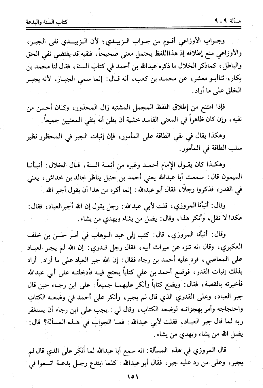 وَقَالَ: أَنْبَأَنَا الْمَرْوَزِيِّ، قَالَ: كُتِبَ إلَى عَبْدِ الْوَهَّابِ فِي أَمْرِ حَسَنِ بْنِ خَلَفٍ الْعُكْبَرِيِّ، وَقَالَ إنَّهُ تَنَزَّهَ عَنْ مِيرَاثِ أَبِيهِ، فَقَالَ رَجُلٌ قَدَرِيٌّ: إنَّ اللَّهَ لَمْ يُجْبِرْ الْعِبَادَ عَلَى الْمَعَاصِي، فَرَدَّ عَلَيْهِ أَحْمَدُ بْنُ رَجَاءٍ فَقَالَ: إنَّ اللَّهَ جَبَرَ الْعِبَادَ عَلَى مَا أَرَادَ. أَرَادَ بِذَلِكَ إثْبَاتَ الْقَدَرِ، فَوَضَعَ أَحْمَدُ بْنُ عَلِيٍّ كِتَابًا يَحْتَجُّ فِيهِ فَأَدْخَلْته عَلَى أَبِي عَبْدِ اللَّهِ فَأَخْبَرْته بِالْقِصَّةِ، فَقَالَ: وَيَضَعُ كِتَابًا وَأَنْكَرَ عَلَيْهِمَا جَمِيعًا: عَلَى ابْنِ رَجَاءٍ حِينَ قَالَ جَبَرَ الْعِبَادَ، وَعَلَى الْقَدَرِيِّ الَّذِي قَالَ لَمْ يُجْبِرْ، وَأَنْكَرَ عَلَى أَحْمَدَ فِي وَضْعِهِ الْكِتَابَ وَاحْتِجَاجِهِ وَأَمَرَ بِهِجْرَانِهِ لِوَضْعِهِ الْكِتَابَ، وَقَالَ لِي: يَجِبُ عَلَى ابْنِ رَجَاءَ أَنْ يَسْتَغْفِرَ رَبَّهُ لَمَّا قَالَ جَبَرَ الْعِبَادَ، فَقُلْت لِأَبِي عَبْدِ اللَّهِ: فَمَا الْجَوَابُ فِي هَذِهِ الْمَسْأَلَةِ؟ قَالَ: يُضِلُّ اللَّهُ مَنْ يَشَاءُ وَيَهْدِي مَنْ يَشَاءُ.