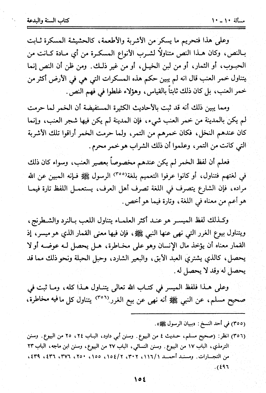 فَعُلِمَ أَنَّ لَفْظَ الْخَمْرِ لَمْ يَكُنْ عِنْدَهُمْ مَخْصُوصًا بِعَصِيرِ الْعِنَبِ، وَسَوَاءٌ كَانَ ذَلِكَ فِي لُغَتِهِمْ فَتَنَاوَلَ، أَوْ كَانُوا عَرَفُوا التَّعْمِيمَ بِلُغَةِ الرَّسُولِ - صَلَّى اللَّهُ عَلَيْهِ وَسَلَّمَ - فَإِنَّهُ الْمُبَيِّنُ عَنْ اللَّهِ مُرَادَهُ، فَإِنَّ الشَّارِعَ يَتَصَرَّفُ فِي اللُّغَةِ تَصَرُّفَ أَهْلِ الْعُرْفِ، يَسْتَعْمِلُ اللَّفْظَ تَارَةً فِيمَا هُوَ أَعَمُّ مِنْ مَعْنَاهُ فِي اللُّغَةِ، وَتَارَةً فِيمَا هُوَ أَخَصُّ، وَكَذَلِكَ لَفْظُ الْمَيْسِرِ هُوَ عِنْدَ أَكْثَرِ الْعُلَمَاءِ يَتَنَاوَلُ اللَّعِبَ بِالنَّرْدِ وَالشِّطْرَنْجِ، وَيَتَنَاوَلُ بُيُوعَ الْغَرَرِ الَّتِي نَهَى عَنْهَا النَّبِيُّ - صَلَّى اللَّهُ عَلَيْهِ وَسَلَّمَ - فَإِنَّ فِيهَا مَعْنَى الْقِمَارِ الَّذِي هُوَ مَيْسِرٌ، إذْ الْقِمَارُ مَعْنَاهُ أَنْ يُؤْخَذَ مَالُ الْإِنْسَانِ وَهُوَ عَلَى مُخَاطَرَةٍ، هَلْ يَحْصُلُ لَهُ عِوَضُهُ أَوْ لَا يَحْصُلُ، كَاَلَّذِي يَشْتَرِي الْعَبْدَ الْآبِقَ، وَالْبَعِيرَ الشَّارِدَ، وَحَبَلَ الْحَبَلَةِ وَنَحْوَ ذَلِكَ مِمَّا قَدْ يَحْصُلُ لَهُ وَقَدْ لَا يَحْصُلُ لَهُ.