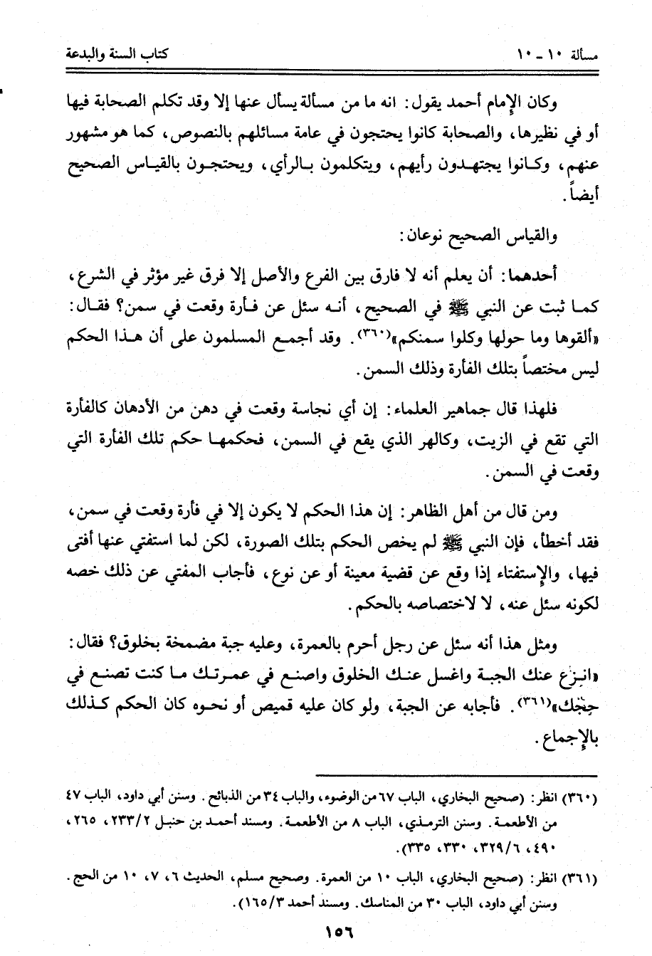 وَالْقِيَاسُ الصَّحِيحُ نَوْعَانِ: أَحَدُهُمَا: أَنْ يَعْلَمَ أَنَّهُ لَا فَارِقَ بَيْنَ الْفَرْعِ وَالْأَصْلِ إلَّا فَرْقًا غَيْرَ مُوَثِّرٍ فِي الشَّرْعِ، كَمَا ثَبَتَ عَنْ النَّبِيِّ - صَلَّى اللَّهُ عَلَيْهِ وَسَلَّمَ - فِي الصَّحِيحِ، أَنَّهُ سُئِلَ عَنْ فَأْرَةٍ وَقَعَتْ فِي سَمْنٍ؟ فَقَالَ: «أَلْقُوهَا وَمَا حَوْلَهَا وَكُلُوا سَمْنَكُمْ» ، وَقَدْ أَجْمَعَ الْمُسْلِمُونَ عَلَى أَنَّ هَذَا الْحُكْمَ لَيْسَ مُخْتَصًّا بِتِلْكَ الْفَأْرَةِ وَذَلِكَ السَّمْنِ. فَلِهَذَا قَالَ جَمَاهِيرُ الْعُلَمَاءِ: إنَّ أَيَّ نَجَاسَةٍ وَقَعَتْ فِي دُهْنٍ مِنْ الْأَدْهَانِ كَالْفَأْرَةِ الَّتِي تَقَعُ فِي الزَّيْتِ، وَكَالْهِرِّ الَّذِي يَقَعُ فِي السَّمْنِ، فَحُكْمُهَا حُكْمُ تِلْكَ الْفَأْرَةِ الَّتِي وَقَعَتْ فِي السَّمْنِ.