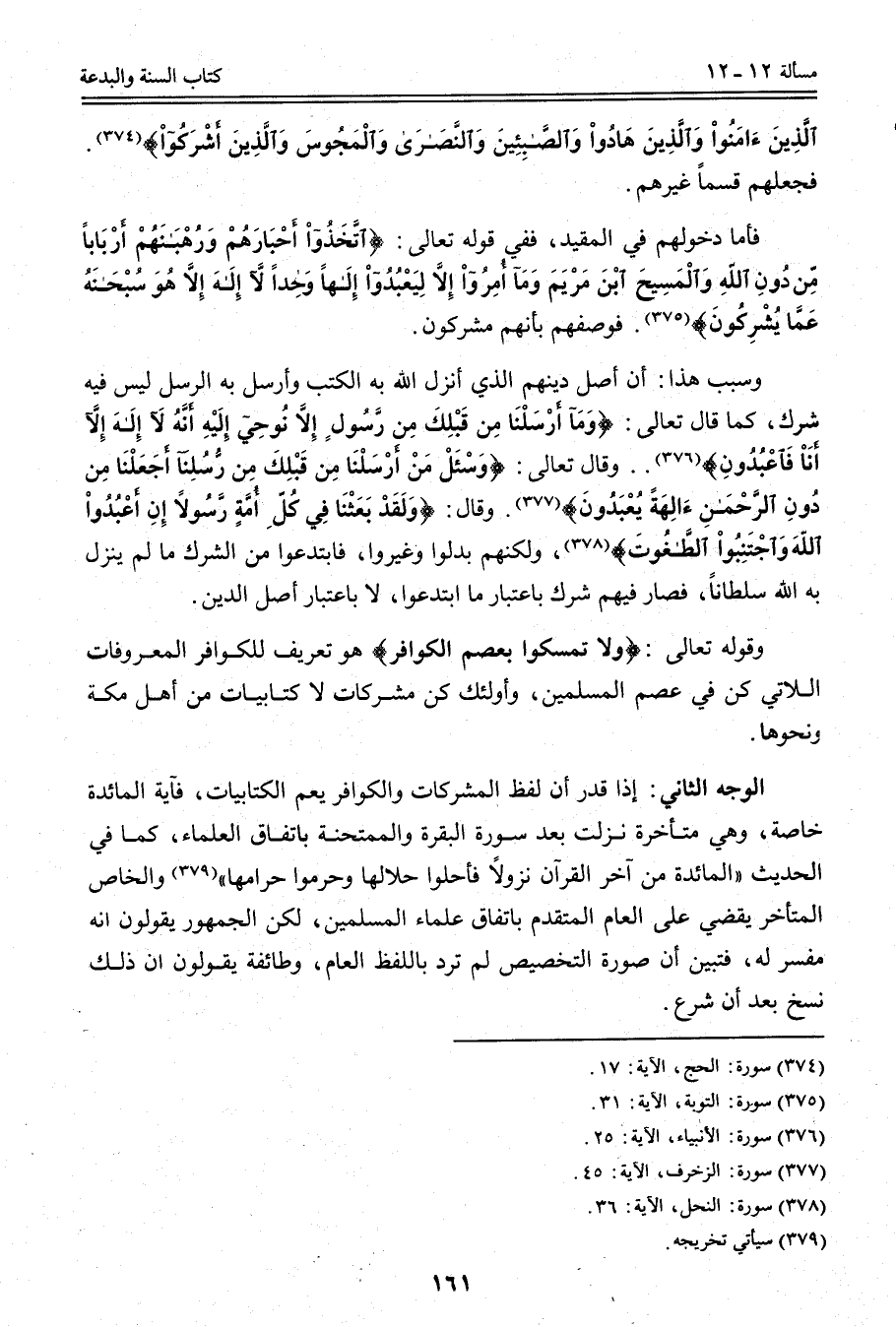 فَجَعَلَهُمْ قِسْمًا غَيْرَهُمْ، فَأَمَّا دُخُولُهُمْ فِي الْمُقَيَّدِ، فَفِي قَوْله تَعَالَى: {اتَّخَذُوا أَحْبَارَهُمْ وَرُهْبَانَهُمْ أَرْبَابًا مِنْ دُونِ اللَّهِ وَالْمَسِيحَ ابْنَ مَرْيَمَ وَمَا أُمِرُوا إِلا لِيَعْبُدُوا إِلَهًا وَاحِدًا لا إِلَهَ إِلا هُوَ سُبْحَانَهُ عَمَّا يُشْرِكُونَ} [التوبة: 31] . فَوَصَفَهُمْ بِأَنَّهُمْ مُشْرِكُونَ. وَسَبَبُ هَذَا: أَنَّ أَصْلَ دِينِهِمْ الَّذِي أَنْزَلَ اللَّهُ بِهِ الْكُتُبَ وَأَرْسَلَ بِهِ الرُّسُلَ لَيْسَ فِيهِ شِرْكٌ، كَمَا قَالَ تَعَالَى: {وَمَا أَرْسَلْنَا مِنْ قَبْلِكَ مِنْ رَسُولٍ إِلا نُوحِي إِلَيْهِ أَنَّهُ لا إِلَهَ إِلا أَنَا فَاعْبُدُونِ} [الأنبياء: 25] .