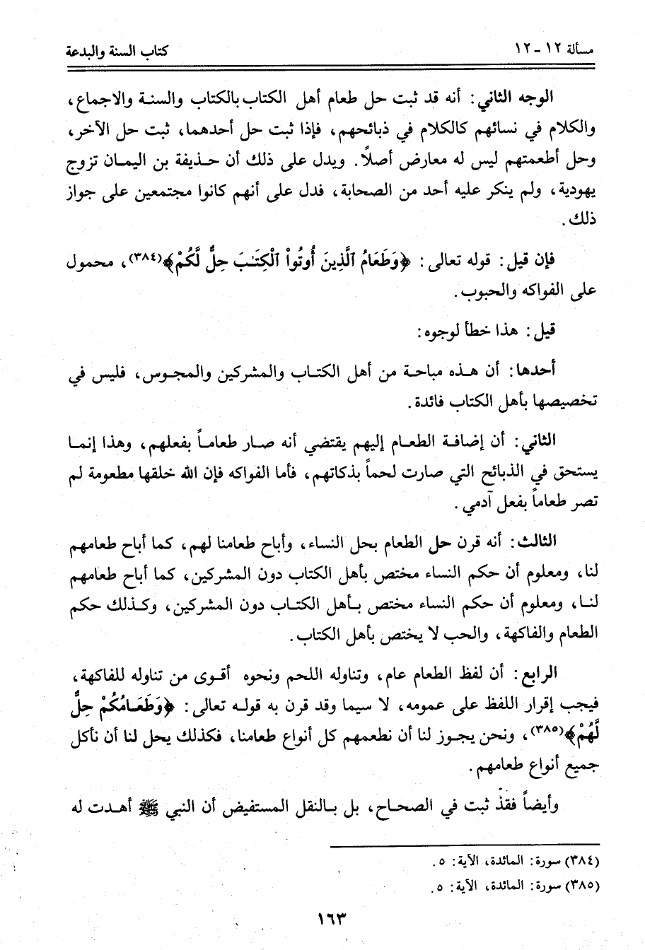 أَحَدُهَا: أَنَّ هَذِهِ مُبَاحَةٌ مِنْ أَهْلِ الْكِتَابِ وَالْمُشْرِكِينَ وَالْمَجُوس، فَلَيْسَ فِي تَخْصِيصِهَا بِأَهْلِ الْكِتَابِ فَائِدَةٌ. الثَّانِي: أَنَّ إضَافَةَ الطَّعَامِ إلَيْهِمْ يَقْتَضِي أَنَّهُ صَارَ طَعَامًا بِفِعْلِهِمْ، وَهَذَا إنَّمَا يُسْتَحَقُّ فِي الذَّبَائِحِ الَّتِي صَارَتْ لَحْمًا بِذَكَاتِهِمْ، فَأَمَّا الْفَوَاكِهُ فَإِنَّ اللَّهَ خَلَقَهَا مَطْعُومَةً لَمْ تَصِرْ طَعَامًا بِفِعْلِ آدَمِيٍّ. الثَّالِثُ: أَنَّهُ قَرَنَ حِلَّ الطَّعَامِ بِحِلِّ النِّسَاءِ، وَأَبَاحَ طَعَامَنَا لَهُمْ، كَمَا أَبَاحَ طَعَامَهُمْ لَنَا، وَمَعْلُومٌ أَنَّ حُكْمَ النِّسَاءِ مُخْتَصٌّ بِأَهْلِ الْكِتَابِ دُونَ الْمُشْرِكِينَ، كَمَا أَبَاحَ طَعَامَهُمْ لَنَا، وَمَعْلُومٌ أَنَّ حُكْمَ النِّسَاءِ مُخْتَصٌّ بِأَهْلِ الْكِتَابِ دُونَ الْمُشْرِكِينَ، وَكَذَلِكَ حُكْمُ الطَّعَامِ وَالْفَاكِهَةِ، وَالْحَبِّ لَا يَخْتَصُّ بِأَهْلِ الْكِتَابِ.