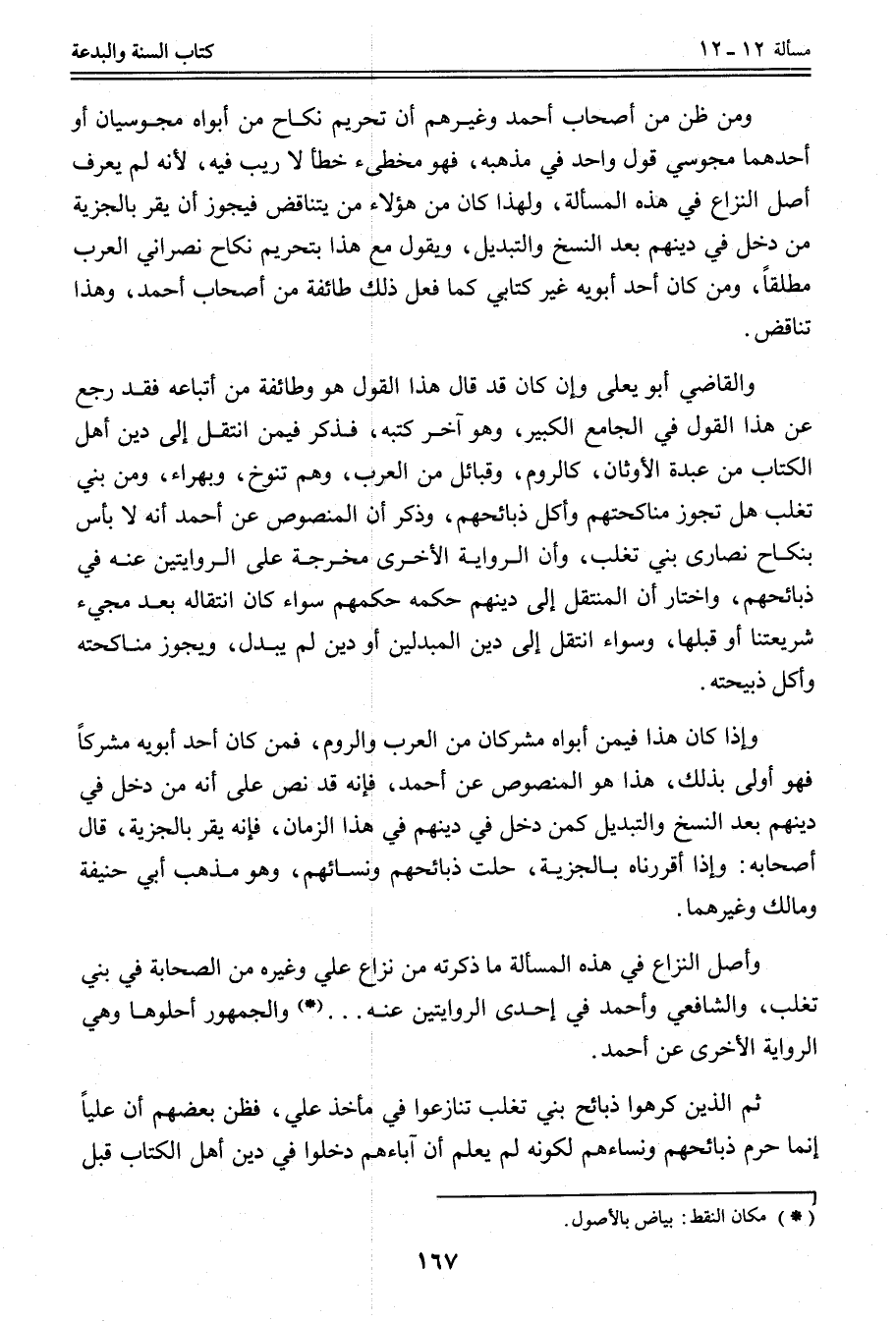 وَالْقَاضِي أَبُو يَعْلَى وَإِنْ كَانَ قَدْ قَالَ هَذَا الْقَوْلَ هُوَ وَطَائِفَةٌ مِنْ أَتْبَاعِهِ فَقَدْ رَجَعَ عَنْ هَذَا الْقَوْلِ فِي الْجَامِعِ الْكَبِيرِ، وَهُوَ آخِرُ كُتُبِهِ، فَذَكَرَ فِيمَنْ انْتَقَلَ إلَى دِينِ أَهْلِ الْكِتَابِ مِنْ عَبَدَةِ الْأَوْثَانِ، كَالرُّومِ، وَقَبَائِلَ مِنْ الْعَرَبِ، وَهُمْ تَنُوخُ، وَبَهْرَاءُ، وَمِنْ بَنِي تَغْلِبَ هَلْ تَجُوزُ مُنَاكَحَتُهُمْ وَأَكْلُ ذَبَائِحِهِمْ، وَذَكَرَ أَنَّ الْمَنْصُوصَ عَنْ أَحْمَدَ أَنَّهُ لَا بَأْسَ بِنِكَاحِ نَصَارَى بَنِي تَغْلِبَ، وَأَنَّ الرِّوَايَةَ الْأُخْرَى مُخَرَّجَةٌ عَلَى الرِّوَايَتَيْنِ عَنْهُ فِي ذَبَائِحِهِمْ، وَاخْتَارَ أَنَّ الْمُنْتَقِلَ إلَى دِينِهِمْ حُكْمُهُ حُكْمُهُمْ سَوَاءٌ كَانَ انْتِقَالُهُ بَعْدَ مَجِيءِ شَرِيعَتِنَا أَوْ قَبْلَهَا، وَسَوَاءٌ انْتَقَلَ إلَى دِينِ الْمُبَدِّلِينَ أَوْ دِينٍ لَمْ يُبَدَّلْ، وَيَجُوزُ مُنَاكَحَتُهُ وَأَكْلُ ذَبِيحَتِهِ.