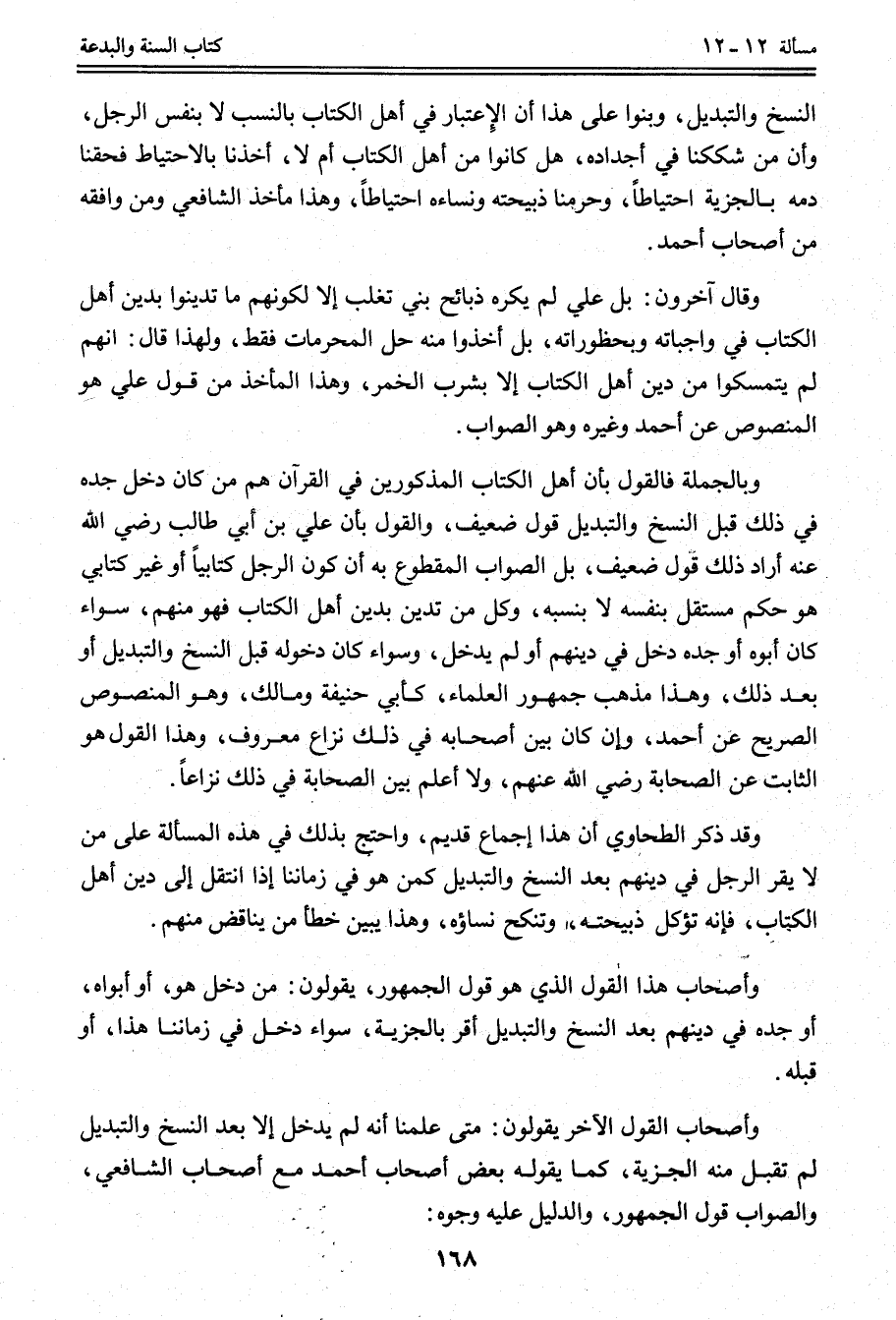 وَقَالَ آخَرُونَ: بَلْ عَلِيٌّ لَمْ يَكْرَهْ ذَبَائِحَ بَنِي تَغْلِبَ إلَّا لِكَوْنِهِمْ مَا تَدَيَّنُوا بِدِينِ أَهْلِ الْكِتَابِ فِي وَاجِبَاتِهِ وَمَحْظُورَاتِهِ، بَلْ أَخَذُوا مِنْهُ حِلَّ الْمُحَرَّمَاتِ فَقَطْ، وَلِهَذَا قَالَ: إنَّهُمْ لَمْ يَتَمَسَّكُوا مِنْ دِينِ أَهْلِ الْكِتَابِ إلَّا بِشُرْبِ الْخَمْرِ، وَهَذَا الْمَأْخَذُ مِنْ قَوْلِ عَلِيٍّ هُوَ الْمَنْصُوصُ عَنْ أَحْمَدَ وَغَيْرِهِ وَهُوَ الصَّوَابُ. وَبِالْجُمْلَةِ فَالْقَوْلُ بِأَنَّ أَهْلَ الْكِتَابِ الْمَذْكُورِينَ فِي الْقُرْآنِ هُمْ مَنْ كَانَ دَخَلَ جَدُّهُ فِي ذَلِكَ قَبْلَ النَّسْخِ وَالتَّبْدِيلِ قَوْلٌ ضَعِيفٌ، وَالْقَوْلُ بِأَنَّ عَلِيَّ بْنَ أَبِي طَالِبٍ - رَضِيَ اللَّهُ عَنْهُ - أَرَادَ ذَلِكَ قَوْلٌ ضَعِيفٌ، بَلْ الصَّوَابُ الْمَقْطُوعُ بِهِ أَنَّ كَوْنَ الرَّجُلِ كِتَابِيًّا أَوْ غَيْرَ كِتَابِيٍّ هُوَ حُكْمٌ مُسْتَقِلٌّ بِنَفْسِهِ لَا بِنَسَبِهِ، وَكُلُّ مَنْ تَدَيَّنَ بِدِينِ أَهْلِ الْكِتَابِ فَهُوَ مِنْهُمْ، سَوَاءٌ كَانَ أَبُوهُ أَوْ جَدُّهُ دَخَلَ فِي دِينِهِمْ أَوْ لَمْ يَدْخُلْ، وَسَوَاءٌ كَانَ دُخُولُهُ قَبْلَ النَّسْخِ وَالتَّبْدِيلِ أَوْ بَعْدَ ذَلِكَ، وَهَذَا مَذْهَبُ جُمْهُورِ الْعُلَمَاءِ، كَأَبِي حَنِيفَةَ وَمَالِكٍ، وَهُوَ الْمَنْصُوصُ الصَّرِيحُ عَنْ أَحْمَدَ، وَإِنْ كَانَ بَيْنَ أَصْحَابِهِ فِي ذَلِكَ نِزَاعٌ مَعْرُوفٌ، وَهَذَا الْقَوْلُ هُوَ الثَّابِتُ عَنْ الصَّحَابَةِ - رَضِيَ اللَّهُ عَنْهُمْ -، وَلَا أَعْلَمُ بَيْنَ الصَّحَابَةِ فِي ذَلِكَ نِزَاعًا.