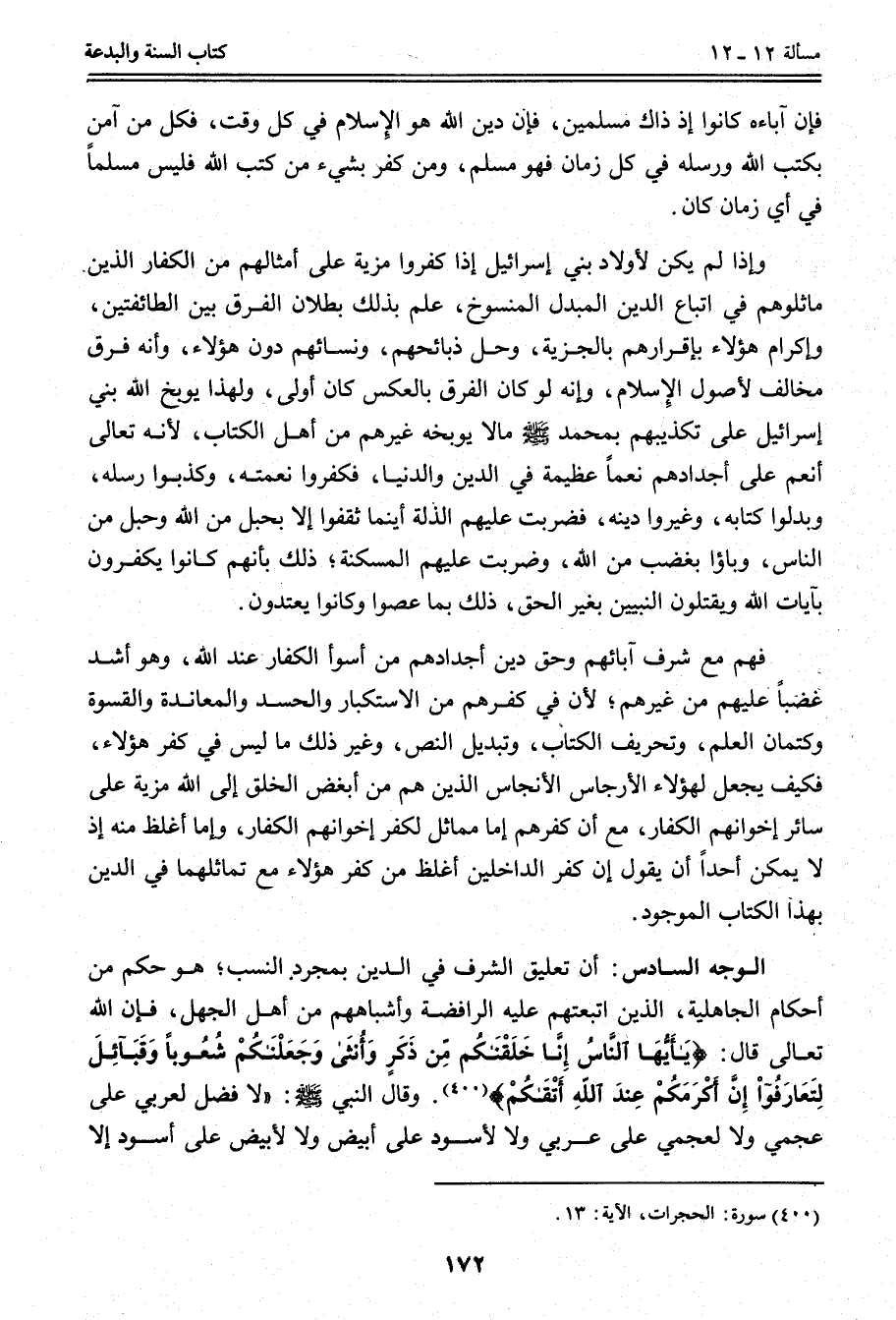 الْوَجْهُ السَّادِسُ: أَنَّ تَعْلِيقَ الشَّرَفِ فِي الدِّينِ بِمُجَرَّدِ النَّسَبِ؛ هُوَ حُكْمٌ مِنْ أَحْكَامِ الْجَاهِلِيَّةِ، الَّذِينَ اتَّبَعَتْهُمْ عَلَيْهِ الرَّافِضَةُ وَأَشْبَاهُهُمْ مِنْ أَهْلِ الْجَهْلِ، فَإِنَّ اللَّهَ تَعَالَى قَالَ: {يَا أَيُّهَا النَّاسُ إِنَّا خَلَقْنَاكُمْ مِنْ ذَكَرٍ وَأُنْثَى وَجَعَلْنَاكُمْ شُعُوبًا وَقَبَائِلَ لِتَعَارَفُوا إِنَّ أَكْرَمَكُمْ عِنْدَ اللَّهِ أَتْقَاكُمْ} [الحجرات: 13] . وَقَالَ النَّبِيُّ - صَلَّى اللَّهُ عَلَيْهِ وَسَلَّمَ -: «لَا فَضْلَ لِعَرَبِيٍّ عَلَى عَجَمِيٍّ وَلَا لِعَجَمِيٍّ عَلَى عَرَبِيٍّ وَلَا لِأَسْوَدَ عَلَى أَبْيَضَ وَلَا لِأَبْيَضَ عَلَى أَسْوَدَ إلَّا