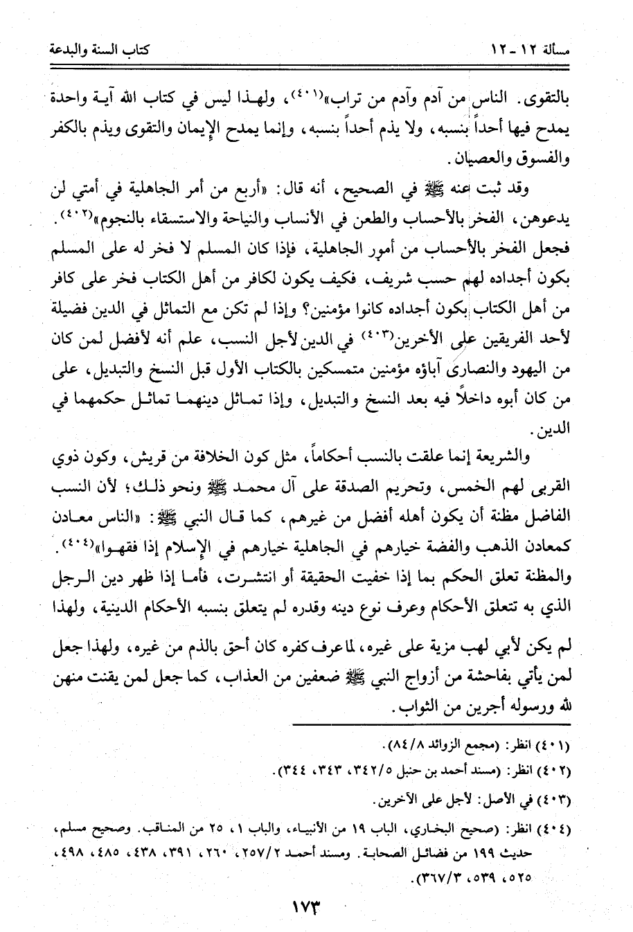 فَجَعَلَ الْفَخْرَ بِالْأَحْسَابِ مِنْ أُمُورِ الْجَاهِلِيَّةِ، فَإِذَا كَانَ الْمُسْلِمُ لَا فَخْرَ لَهُ عَلَى الْمُسْلِمِ بِكَوْنِ أَجْدَادِهِ لَهُمْ حَسَبٌ شَرِيفٌ، فَكَيْفَ يَكُونُ لِكَافِرٍ مِنْ أَهْلِ الْكِتَابِ فَخْرٌ عَلَى كَافِرٍ مِنْ أَهْلِ الْكِتَابِ بِكَوْنِ أَجْدَادِهِ كَانُوا مُؤْمِنِينَ؟ وَإِذَا لَمْ تَكُنْ مَعَ التَّمَاثُلِ فِي الدِّينِ فَضِيلَةٌ لِأَحَدِ الْفَرِيقَيْنِ عَلَى الْآخَرِينَ فِي الدِّينِ لِأَجْلِ النَّسَبِ، عُلِمَ أَنَّهُ لَا فَضْلَ لِمَنْ كَانَ مِنْ الْيَهُودِ وَالنَّصَارَى آبَاؤُهُ مُؤْمِنِينَ مُتَمَسِّكِينَ بِالْكِتَابِ الْأَوَّلِ قَبْلَ النَّسْخِ وَالتَّبْدِيلِ، عَلَى مَنْ كَانَ أَبُوهُ دَاخِلًا فِيهِ بَعْدَ النَّسْخِ وَالتَّبْدِيلِ، وَإِذَا تَمَاثَلَ دِينُهُمَا تَمَاثَلَ حُكْمُهُمَا فِي الدِّينِ.
