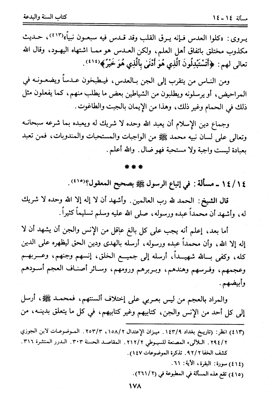 فِي اتِّبَاعِ الرَّسُولِ - صَلَّى اللَّهُ عَلَيْهِ وَسَلَّمَ - بِصَحِيحِ الْمَعْقُولِ؟ . قَالَ الشَّيْخُ: الْحَمْدُ لِلَّهِ رَبِّ الْعَالَمِينَ. وَأَشْهَدُ أَنْ لَا إلَهَ إلَّا اللَّهُ وَحْدَهُ لَا شَرِيكَ لَهُ، وَأَشْهَدُ أَنَّ مُحَمَّدًا عَبْدُهُ وَرَسُولُهُ - صَلَّى اللَّهُ عَلَيْهِ وَسَلَّمَ - تَسْلِيمًا كَثِيرًا. أَمَّا بَعْدُ، اعْلَمْ أَنَّهُ يَجِبُ عَلَى كُلِّ بَالِغٍ عَاقِلٍ مِنْ الْإِنْسِ وَالْجِنِّ أَنْ يَشْهَدَ أَنْ لَا إلَهَ إلَّا اللَّهُ، وَأَنَّ مُحَمَّدًا عَبْدُهُ وَرَسُولُهُ، أَرْسَلَهُ بِالْهُدَى وَدِينِ الْحَقِّ لِيُظْهِرَهُ عَلَى الدِّينِ كُلِّهِ، وَكَفَى بِاَللَّهِ شَهِيدًا، أَرْسَلَهُ إلَى جَمِيعِ الْخَلْقِ، إنْسِهِمْ وَجِنِّهِمْ، وَعَرَبِهِمْ وَعَجَمِهِمْ، وَفُرْسِهِمْ وَهِنْدِهِمْ، وَبَرْبَرِهِمْ وَرُومِهِمْ، وَسَائِرِ أَصْنَافِ الْعَجَمِ أَسْوَدِهِمْ وَأَبْيَضِهِمْ. وَالْمُرَادُ بِالْعَجَمِ مَنْ لَيْسَ بِعَرَبِيٍّ عَلَى اخْتِلَافِ أَلْسِنَتِهِمْ، فَمُحَمَّدٌ - صَلَّى اللَّهُ عَلَيْهِ وَسَلَّمَ - أُرْسِلَ إلَى كُلِّ أَحَدٍ مِنْ الْإِنْسِ وَالْجِنِّ، كِتَابِيِّهِمْ وَغَيْرِ كِتَابِيِّهِمْ، فِي كُلِّ مَا يَتَعَلَّقُ بِدِينِهِ، مِنْ