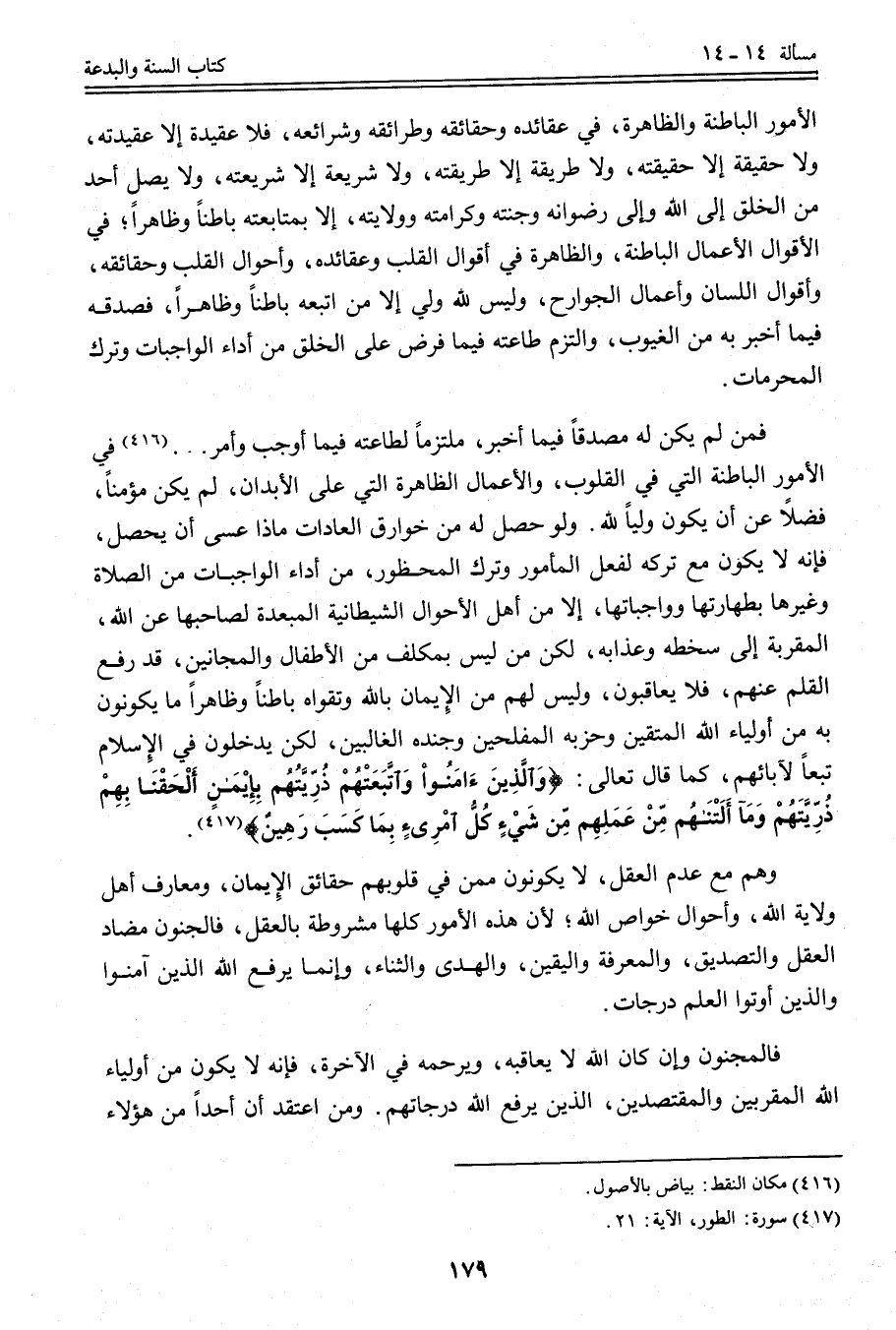 وَهُمْ مَعَ عَدَمِ الْعَقْلِ، لَا يَكُونُونَ مِمَّنْ فِي قُلُوبِهِمْ حَقَائِقُ الْإِيمَانِ، وَمَعَارِفُ أَهْلِ وِلَايَةِ اللَّهِ، وَأَحْوَالُ خَوَاصِّ اللَّهِ؛ لِأَنَّ هَذِهِ الْأُمُورَ كُلَّهَا مَشْرُوطَةٌ بِالْعَقْلِ، فَالْجُنُونُ مُضَادُّ الْعَقْلِ وَالتَّصْدِيقِ، وَالْمَعْرِفَةِ وَالْيَقِينِ، وَالْهُدَى وَالثَّنَاءِ، وَإِنَّمَا يَرْفَعُ اللَّهُ الَّذِينَ آمَنُوا وَاَلَّذِينَ أُوتُوا الْعِلْمَ دَرَجَاتٍ.