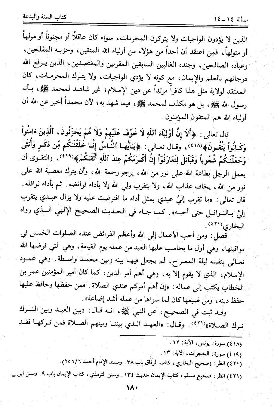الَّذِينَ لَا يُؤَدُّونَ الْوَاجِبَاتِ وَلَا يَتْرُكُونَ الْمُحَرَّمَاتِ، سَوَاءٌ كَانَ عَاقِلًا أَوْ مَجْنُونًا أَوْ مُولِهًا أَوْ مُتَوَلِّهًا، فَمَنْ اعْتَقَدَ أَنَّ أَحَدًا مِنْ هَؤُلَاءِ مِنْ أَوْلِيَاءِ اللَّهِ الْمُتَّقِينَ، وَحِزْبِهِ الْمُفْلِحِينَ، وَعِبَادِهِ الصَّالِحِينَ، وَجُنْدِهِ الْغَالِبِينَ السَّابِقِينَ الْمُقَرَّبِينَ وَالْمُقْتَصِدِينَ، الَّذِينَ يَرْفَعُ اللَّهُ دَرَجَاتِهِمْ بِالْعِلْمِ وَالْإِيمَانِ، مَعَ كَوْنِهِ لَا يُؤَدِّي الْوَاجِبَاتِ، وَلَا يَتْرُكُ الْمُحَرَّمَاتِ، كَانَ الْمُعْتَقِدُ لِوِلَايَةِ مِثْلِ هَذَا كَافِرًا مُرْتَدًّا عَنْ دِينِ الْإِسْلَامِ؛ غَيْرِ شَاهِدٍ لِمُحَمَّدٍ - صَلَّى اللَّهُ عَلَيْهِ وَسَلَّمَ -، بِأَنَّهُ رَسُولُ اللَّهِ - صَلَّى اللَّهُ عَلَيْهِ وَسَلَّمَ - بَلْ هُوَ مُكَذِّبٌ لِمُحَمَّدٍ - صَلَّى اللَّهُ عَلَيْهِ وَسَلَّمَ - فِيمَا شَهِدَ بِهِ؛ لِأَنَّ مُحَمَّدًا أَخْبَرَ عَنْ اللَّهِ أَنَّ أَوْلِيَاءَ اللَّهِ هُمْ الْمُتَّقُونَ الْمُؤْمِنُونَ.