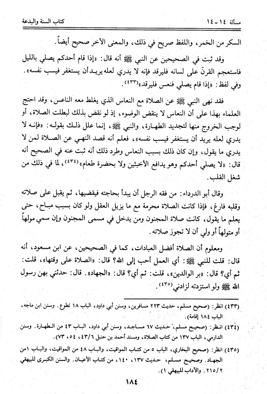 فَقَدْ نَهَى النَّبِيُّ - صَلَّى اللَّهُ عَلَيْهِ وَسَلَّمَ - عَنْ الصَّلَاةِ مَعَ النُّعَاسِ الَّذِي يَغْلَطُ مَعَهُ النَّاعِسُ، وَقَدْ احْتَجَّ الْعُلَمَاءُ بِهَذَا عَلَى أَنَّ النُّعَاسَ لَا يَنْقُضُ الْوُضُوءَ، إذْ لَوْ نَقَضَ بِذَلِكَ لَبَطَلَتْ الصَّلَاةُ، أَوْ لَوَجَبَ الْخُرُوجُ مِنْهَا لِتَجْدِيدِ الطَّهَارَةِ، وَالنَّبِيُّ - صَلَّى اللَّهُ عَلَيْهِ وَسَلَّمَ - إنَّمَا عَلَّلَ ذَلِكَ بِقَوْلِهِ: «فَإِنَّهُ لَا يَدْرِي لَعَلَّهُ يُرِيدُ أَنْ يَسْتَغْفِرَ فَيَسُبَّ نَفْسَهُ» ، فَعُلِمَ أَنَّهُ قَصَدَ النَّهْيَ عَنْ الصَّلَاةِ لِمَنْ لَا يَدْرِي مَا يَقُولُ، وَإِنْ كَانَ ذَلِكَ بِسَبَبِ النُّعَاسِ وَطَرْدِ ذَلِكَ أَنَّهُ ثَبَتَ عَنْهُ فِي الصَّحِيحِ أَنَّهُ قَالَ: «لَا يُصَلِّي أَحَدُكُمْ وَهُوَ يُدَافِعُ الْأَخْبَثَيْنِ وَلَا بِحَضْرَةِ طَعَامٍ» ، لِمَا فِي ذَلِكَ مِنْ شَغْلِ الْقَلْبِ.