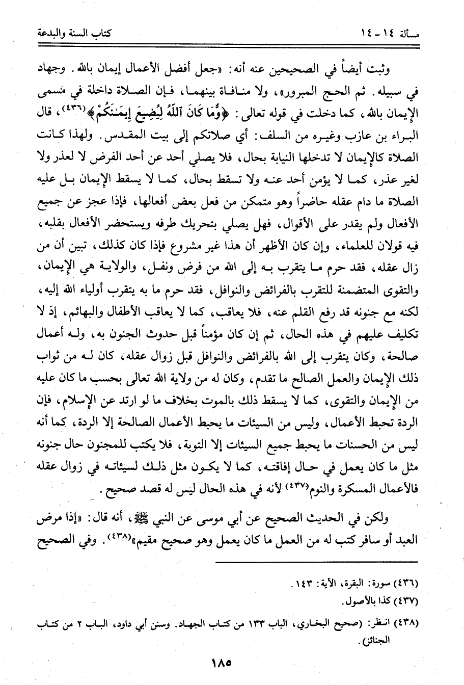 وَثَبَتَ أَيْضًا فِي الصَّحِيحَيْنِ عَنْهُ أَنَّهُ: «جَعَلَ أَفْضَلَ الْأَعْمَالِ إيمَانٌ بِاَللَّهِ، وَجِهَادٌ فِي سَبِيلِهِ ثُمَّ الْحَجُّ الْمَبْرُورُ» ، وَلَا مُنَافَاةَ بَيْنَهُمَا، فَإِنَّ الصَّلَاةَ دَاخِلَةٌ فِي مُسَمَّى الْإِيمَانِ بِاَللَّهِ، كَمَا دَخَلَتْ فِي قَوْله تَعَالَى: {وَمَا كَانَ اللَّهُ لِيُضِيعَ إِيمَانَكُمْ} [البقرة: 143] ، قَالَ الْبَرَاءُ بْنُ عَازِبٍ وَغَيْرُهُ مِنْ السَّلَفِ: أَيْ صَلَاتَكُمْ إلَى بَيْتِ الْمَقْدِسِ، وَلِهَذَا كَانَتْ الصَّلَاةُ كَالْإِيمَانِ لَا تَدْخُلُهَا النِّيَابَةُ بِحَالٍ، فَلَا يُصَلِّي أَحَدٌ عَنْ أَحَدٍ الْفَرْضَ لَا لِعُذْرٍ وَلَا لِغَيْرِ عُذْرٍ، كَمَا لَا يُؤْمِنُ أَحَدٌ عَنْهُ وَلَا تَسْقُطُ بِحَالٍ، كَمَا لَا يَسْقُطُ الْإِيمَانُ بَلْ عَلَيْهِ الصَّلَاةُ مَا دَامَ عَقْلُهُ حَاضِرًا وَهُوَ مُتَمَكِّنٌ مِنْ فِعْلِ بَعْضِ أَفْعَالِهَا.