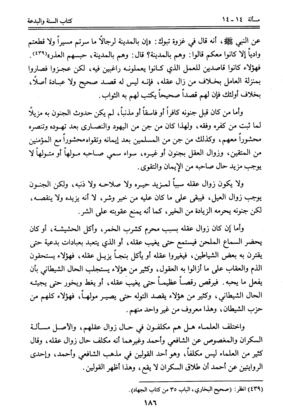 عَنْ النَّبِيِّ - صَلَّى اللَّهُ عَلَيْهِ وَسَلَّمَ - «أَنَّهُ قَالَ فِي غَزْوَةِ تَبُوكَ: إنَّ بِالْمَدِينَةِ لَرِجَالًا مَا سِرْتُمْ مَسِيرًا وَلَا قَطَعْتُمْ وَادِيًا إلَّا كَانُوا مَعَكُمْ قَالُوا: وَهُمْ بِالْمَدِينَةِ؟ قَالَ: وَهُمْ بِالْمَدِينَةِ، حَبَسَهُمْ الْعُذْرُ» . فَهَؤُلَاءِ كَانُوا قَاصِدِينَ لِلْعَمَلِ الَّذِي كَانُوا يَعْمَلُونَهُ رَاغِبِينَ فِيهِ، لَكِنْ عَجَزُوا فَصَارُوا بِمَنْزِلَةِ الْعَامِلِ بِخِلَافِ مَنْ زَالَ عَقْلُهُ، فَإِنَّهُ لَيْسَ لَهُ قَصْدٌ صَحِيحٌ وَلَا عِبَادَةٌ أَصْلًا، بِخِلَافِ أُولَئِكَ فَإِنَّ لَهُمْ قَصْدًا صَحِيحًا يُكْتَبُ لَهُمْ بِهِ الثَّوَابُ.