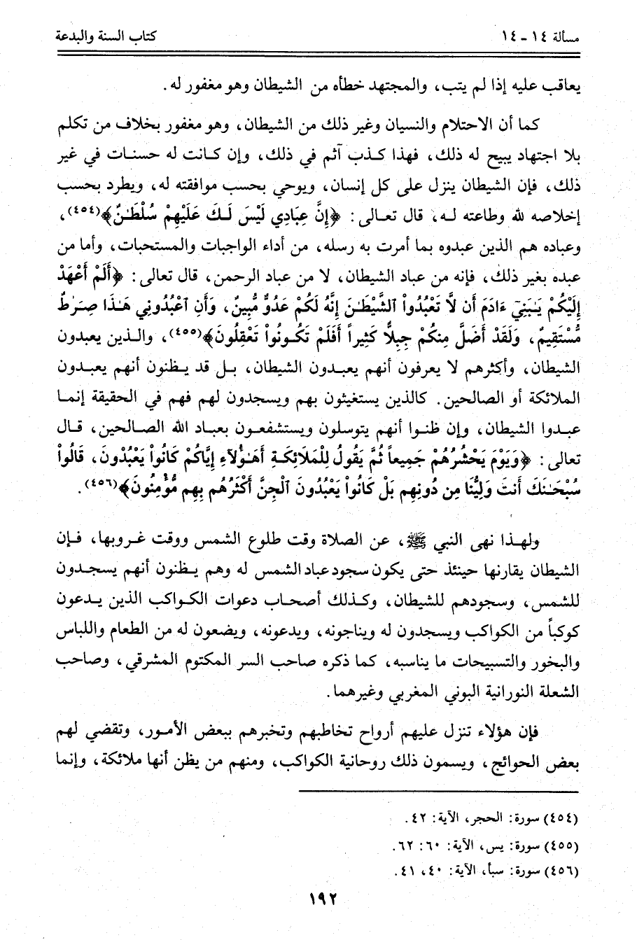 كَمَا أَنَّ الِاحْتِلَامَ وَالنِّسْيَانَ وَغَيْرَ ذَلِكَ مِنْ الشَّيْطَانِ، وَهُوَ مَغْفُورٌ بِخِلَافِ مَنْ تَكَلَّمَ بِلَا اجْتِهَادٍ يُبِيحُ لَهُ ذَلِكَ، فَهَذَا كَذِبٌ آثِمٌ فِي ذَلِكَ، وَإِنْ كَانَتْ لَهُ حَسَنَاتٌ فِي غَيْرِ ذَلِكَ، فَإِنَّ الشَّيْطَانَ يَنْزِلُ عَلَى كُلِّ إنْسَانٍ، وَيُوحِي بِحَسَبِ مُوَافَقَتِهِ لَهُ، وَيُطْرَدُ بِحَسَبِ إخْلَاصِهِ لِلَّهِ وَطَاعَتِهِ لَهُ، قَالَ تَعَالَى: {إِنَّ عِبَادِي لَيْسَ لَكَ عَلَيْهِمْ سُلْطَانٌ} [الإسراء: 65] ، وَعِبَادُهُ هُمْ الَّذِينَ عَبَدُوهُ بِمَا أَمَرَتْ بِهِ رُسُلُهُ، مِنْ أَدَاءِ الْوَاجِبَاتِ وَالْمُسْتَحَبَّاتِ، وَأَمَّا مَنْ عَبَدَهُ بِغَيْرِ ذَلِكَ، فَإِنَّهُ مِنْ عِبَادِ الشَّيْطَانِ، لَا مِنْ عِبَادِ الرَّحْمَنِ.