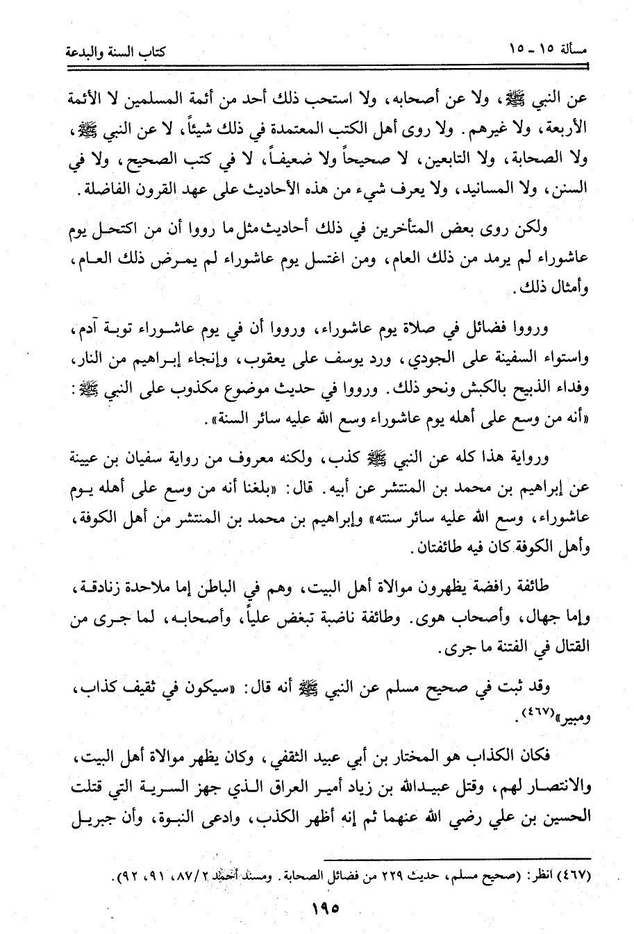 وَرِوَايَةُ هَذَا كُلِّهِ عَنْ النَّبِيِّ - صَلَّى اللَّهُ عَلَيْهِ وَسَلَّمَ - كَذِبٌ، وَلَكِنَّهُ مَعْرُوفٌ مِنْ رِوَايَةِ سُفْيَانَ بْنِ عُيَيْنَةَ عَنْ إبْرَاهِيمَ بْنِ مُحَمَّدِ بْنِ الْمُنْتَشِرِ عَنْ أَبِيهِ. قَالَ: «بَلَغَنَا أَنَّهُ مَنْ وَسَّعَ عَلَى أَهْلِهِ يَوْمَ عَاشُورَاءَ، وَسَّعَ اللَّهُ عَلَيْهِ سَائِرَ سَنَتِهِ» وَإِبْرَاهِيمُ بْنُ مُحَمَّدِ بْنِ الْمُنْتَشِرِ مِنْ أَهْلِ الْكُوفَةِ، وَأَهْلُ الْكُوفَةِ كَانَ فِيهِ طَائِفَتَانِ.