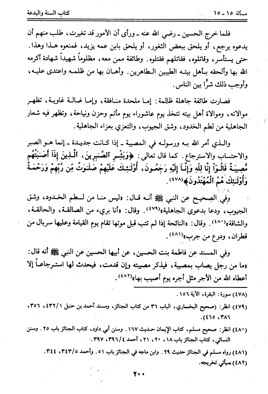 فَصَارَتْ طَائِفَةٌ جَاهِلَةٌ ظَالِمَةٌ: إمَّا مُلْحِدَةٌ مُنَافِقَةٌ، وَإِمَّا ضَالَّةٌ غَاوِيَةٌ، تُظْهِرُ مُوَالَاتَهُ، وَمُوَالَاةَ أَهْلِ بَيْتِهِ تَتَّخِذُ يَوْمَ عَاشُورَاءَ يَوْمَ مَأْتَمٍ وَحُزْنٍ وَنِيَاحَةٍ، وَتُظْهِرُ فِيهِ شِعَارَ الْجَاهِلِيَّةِ مِنْ لَطْمِ الْخُدُودِ، وَشَقِّ الْجُيُوبِ، وَالتَّعَزِّي بِعَزَاءِ الْجَاهِلِيَّةِ. وَاَلَّذِي أَمَرَ اللَّهُ بِهِ وَرَسُولُهُ فِي الْمُصِيبَةِ - إذَا كَانَتْ جَدِيدَةً - إنَّمَا هُوَ الصَّبْرُ وَالِاحْتِسَابُ وَالِاسْتِرْجَاعُ. كَمَا قَالَ تَعَالَى: {وَبَشِّرِ الصَّابِرِينَ} [البقرة: 155] {الَّذِينَ إِذَا أَصَابَتْهُمْ مُصِيبَةٌ قَالُوا إِنَّا لِلَّهِ وَإِنَّا إِلَيْهِ رَاجِعُونَ} [البقرة: 156] {أُولَئِكَ عَلَيْهِمْ صَلَوَاتٌ مِنْ رَبِّهِمْ وَرَحْمَةٌ وَأُولَئِكَ هُمُ الْمُهْتَدُونَ} [البقرة: 157] .