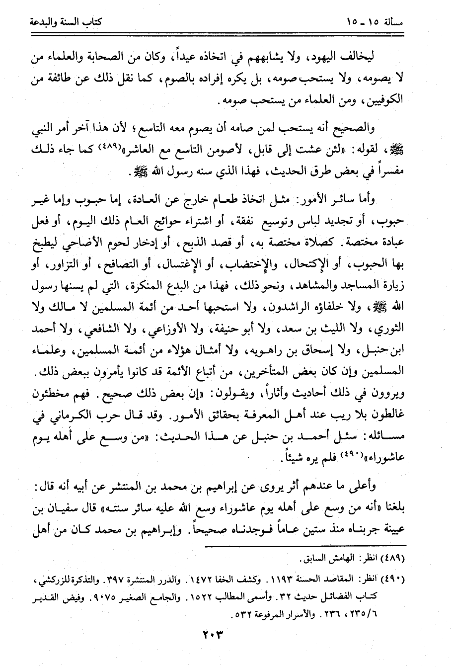 وَقَدْ قَالَ حَرْبٌ الْكَرْمَانِيُّ فِي مَسَائِلِهِ: سُئِلَ أَحْمَدُ بْنُ حَنْبَلٍ عَنْ هَذَا الْحَدِيثِ: «مَنْ وَسَّعَ عَلَى أَهْلِهِ يَوْمَ عَاشُورَاءَ» فَلَمْ يَرَهُ شَيْئًا. وَأَعْلَى مَا عِنْدَهُمْ أَثَرٌ يُرْوَى عَنْ إبْرَاهِيمَ بْنِ مُحَمَّدِ بْنِ الْمُنْتَشِرِ عَنْ أَبِيهِ أَنَّهُ قَالَ: بَلَغَنَا «أَنَّهُ مَنْ وَسَّعَ عَلَى أَهْلِهِ يَوْمَ عَاشُورَاءَ وَسَّعَ اللَّهُ عَلَيْهِ سَائِرَ سَنَتِهِ» قَالَ سُفْيَانُ بْنُ عُيَيْنَةَ جَرَّبْنَاهُ مُنْذُ سِتِّينَ عَامًا فَوَجَدْنَاهُ صَحِيحًا. وَإِبْرَاهِيمُ بْنُ مُحَمَّدٍ كَانَ مِنْ أَهْلِ الْكُوفَةِ،