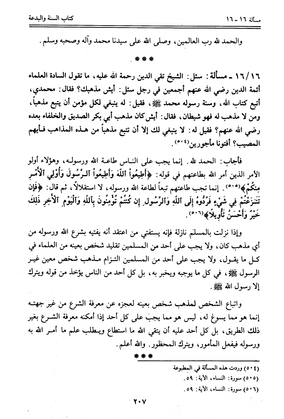 وَإِذَا نَزَلَتْ بِالْمُسْلِمِ نَازِلَةٌ فَإِنَّهُ يَسْتَفْتِي مَنْ اعْتَقَدَ أَنَّهُ يُفْتِيهِ بِشَرْعِ اللَّهِ وَرَسُولِهِ مِنْ أَيِّ مَذْهَبٍ كَانَ، وَلَا يَجِبُ عَلَى أَحَدٍ مِنْ الْمُسْلِمِينَ تَقْلِيدُ شَخْصٍ بِعَيْنِهِ مِنْ الْعُلَمَاءِ فِي كُلِّ مَا يَقُولُ، وَلَا يَجِبُ عَلَى أَحَدٍ مِنْ الْمُسْلِمِينَ الْتِزَامُ مَذْهَبِ شَخْصٍ مُعَيَّنٍ غَيْرِ الرَّسُولِ - صَلَّى اللَّهُ عَلَيْهِ وَسَلَّمَ - فِي كُلِّ مَا يُوجِبُهُ وَيُخْبِرُ بِهِ، بَلْ كُلُّ أَحَدٍ مِنْ النَّاسِ يُؤْخَذُ مِنْ قَوْلِهِ وَيُتْرَكُ إلَّا رَسُولَ اللَّهِ - صَلَّى اللَّهُ عَلَيْهِ وَسَلَّمَ -. وَاتِّبَاعُ الشَّخْصِ لِمَذْهَبِ شَخْصٍ بِعَيْنِهِ لِعَجْزِهِ عَنْ مَعْرِفَةِ الشَّرْعِ مِنْ غَيْرِ جِهَتِهِ إنَّمَا هُوَ مِمَّا يَسُوغُ لَهُ، لَيْسَ هُوَ مِمَّا يَجِبُ عَلَى كُلِّ أَحَدٍ إذَا أَمْكَنَهُ مَعْرِفَةُ الشَّرْعِ بِغَيْرِ ذَلِكَ الطَّرِيقِ، بَلْ كُلُّ أَحَدٍ عَلَيْهِ أَنْ يَتَّقِيَ اللَّهَ مَا اسْتَطَاعَ وَيَطْلُبَ عِلْمَ مَا أَمَرَ اللَّهُ بِهِ وَرَسُولُهُ فَيَفْعَلُ الْمَأْمُورَ، وَيَتْرُكُ الْمَحْظُورَ، وَاَللَّهُ أَعْلَمُ