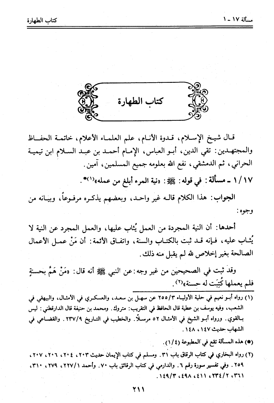 (كِتَابُ الطَّهَارَةِ) قَالَ شَيْخُ الْإِسْلَامِ، قُدْوَةُ الْأَنَامِ، عَلَمُ الْعُلَمَاءِ الْأَعْلَامِ، خَاتِمَةُ الْحُفَّاظِ وَالْمُجْتَهِدِينَ: تَقِيُّ الدِّينِ أَبُو الْعَبَّاسِ الْإِمَامُ أَحْمَدُ بْنُ عَبْدِ السَّلَامِ بْنِ تَيْمِيَّةَ الْحَرَّانِيُّ ثُمَّ الدِّمَشْقِيُّ، نَفَعَ اللَّهُ بِعُلُومِهِ جَمِيعَ الْمُسْلِمِينَ آمِينَ.