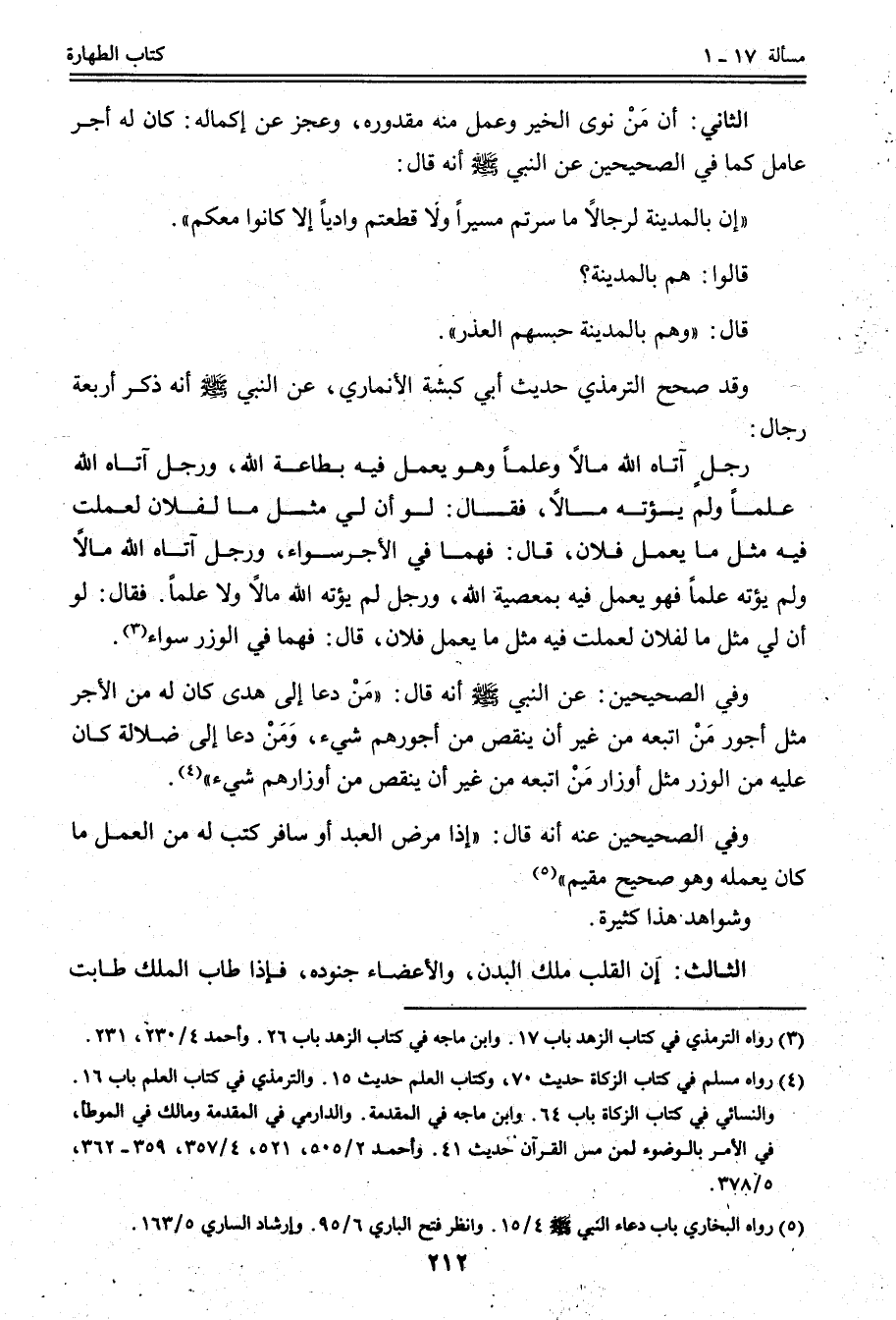 وَفِي الصَّحِيحَيْنِ: عَنْ النَّبِيِّ - صَلَّى اللَّهُ عَلَيْهِ وَسَلَّمَ - أَنَّهُ قَالَ: «مَنْ دَعَا إلَى هُدًى كَانَ لَهُ مِنْ الْأَجْرِ مِثْلُ أُجُورِ مَنْ اتَّبَعَهُ مِنْ غَيْرِ أَنْ يُنْقَصَ مِنْ أُجُورِهِمْ شَيْءٌ، وَمَنْ دَعَا إلَى ضَلَالَةٍ كَانَ عَلَيْهِ مِنْ الْوِزْرِ مِثْلُ أَوْزَارِ مَنْ اتَّبَعَهُ مِنْ غَيْرِ أَنْ يُنْقَصَ مِنْ أَوْزَارِهِمْ شَيْءٌ» . وَفِي الصَّحِيحَيْنِ عَنْهُ أَنَّهُ قَالَ: «إذَا مَرِضَ الْعَبْدُ أَوْ سَافَرَ كُتِبَ لَهُ مِنْ الْعَمَلِ مَا كَانَ يَعْمَلُهُ وَهُوَ صَحِيحٌ مُقِيمٌ» وَشَوَاهِدُ هَذَا كَثِيرَةٌ. الثَّالِثُ: أَنَّ الْقَلْبَ مَلِكُ الْبَدَنِ، وَالْأَعْضَاءُ جُنُودُهُ، فَإِذَا طَابَ الْمَلِكُ طَابَتْ