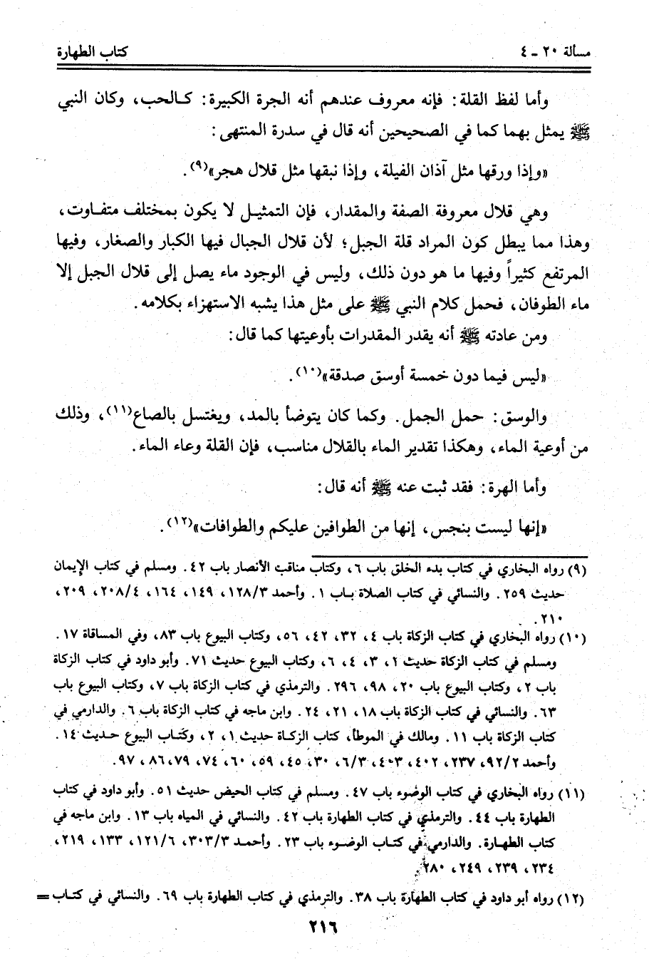 وَمِنْ عَادَتِهِ - صَلَّى اللَّهُ عَلَيْهِ وَسَلَّمَ - أَنَّهُ يُقَدِّرُ الْمُقَدَّرَاتِ بِأَوْعِيَتِهَا كَمَا قَالَ: «لَيْسَ فِيمَا دُونَ خَمْسَةِ أَوْسُقٍ صَدَقَةٌ» . وَالْوَسْقُ: حِمْلُ الْجَمَلِ، وَكَمَا كَانَ يَتَوَضَّأُ بِالْمُدِّ، وَيَغْتَسِلُ بِالصَّاعِ، وَذَلِكَ مِنْ أَوْعِيَةِ الْمَاءِ، وَهَكَذَا تَقْدِيرُ الْمَاءِ بِالْقِلَالِ مُنَاسِبٌ، فَإِنَّ الْقُلَّةَ وِعَاءُ الْمَاءِ. وَأَمَّا الْهِرَّةُ: فَقَدْ ثَبَتَ عَنْهُ - صَلَّى اللَّهُ عَلَيْهِ وَسَلَّمَ - أَنَّهُ قَالَ: «إنَّهَا لَيْسَتْ بِنَجَسٍ، إنَّهَا مِنْ الطَّوَّافِينَ عَلَيْكُمْ وَالطَّوَّافَاتِ» .