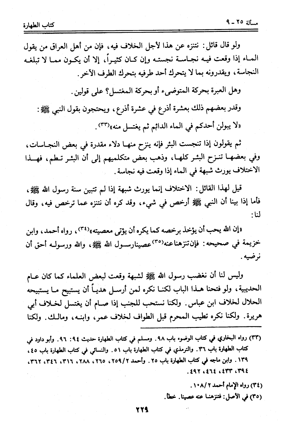 ثُمَّ يَقُولُونَ إذَا تَنَجَّسَتْ الْبِئْرُ فَإِنَّهُ يُنْزَحُ مِنْهَا دِلَاءٌ مُقَدَّرَةٌ فِي بَعْضِ النَّجَاسَاتِ، وَفِي بَعْضِهَا تُنْزَحُ الْبِئْرُ كُلُّهَا، وَذَهَبَ بَعْضُ مُتَكَلِّمِيهِمْ إلَى أَنَّ الْبِئْرَ تُطَمُّ، فَهَذَا الِاخْتِلَافُ يُورِثُ شُبْهَةً فِي الْمَاءِ إذَا وَقَعَتْ فِيهِ نَجَاسَةٌ. قِيلَ لِهَذَا الْقَائِلِ: الِاخْتِلَافُ إنَّمَا يُورِثُ شُبْهَةً إذَا لَمْ تَتَبَيَّنْ سُنَّةُ رَسُولِ اللَّهِ - صَلَّى اللَّهُ عَلَيْهِ وَسَلَّمَ - فَأَمَّا إذَا بَيَّنَّا أَنَّ النَّبِيَّ - صَلَّى اللَّهُ عَلَيْهِ وَسَلَّمَ - أَرْخَصَ فِي شَيْءٍ، وَقَدْ كَرِهَ أَنْ نَتَنَزَّهَ عَمَّا تَرَخَّصَ فِيهِ، وَقَالَ لَنَا: «إنَّ اللَّهَ يُحِبُّ أَنْ يُؤْخَذَ بِرُخَصِهِ كَمَا يَكْرَهُ أَنْ تُؤْتَى مَعْصِيَتُهُ» ، رَوَاهُ أَحْمَدُ، وَابْنُ خُزَيْمَةَ فِي صَحِيحِهِ: فَإِنْ تَنَزَّهْنَا عَنْهُ عَصَيْنَا رَسُولَ اللَّهِ - صَلَّى اللَّهُ عَلَيْهِ وَسَلَّمَ - وَاَللَّهُ وَرَسُولُهُ أَحَقُّ أَنْ نُرْضِيَهُ.