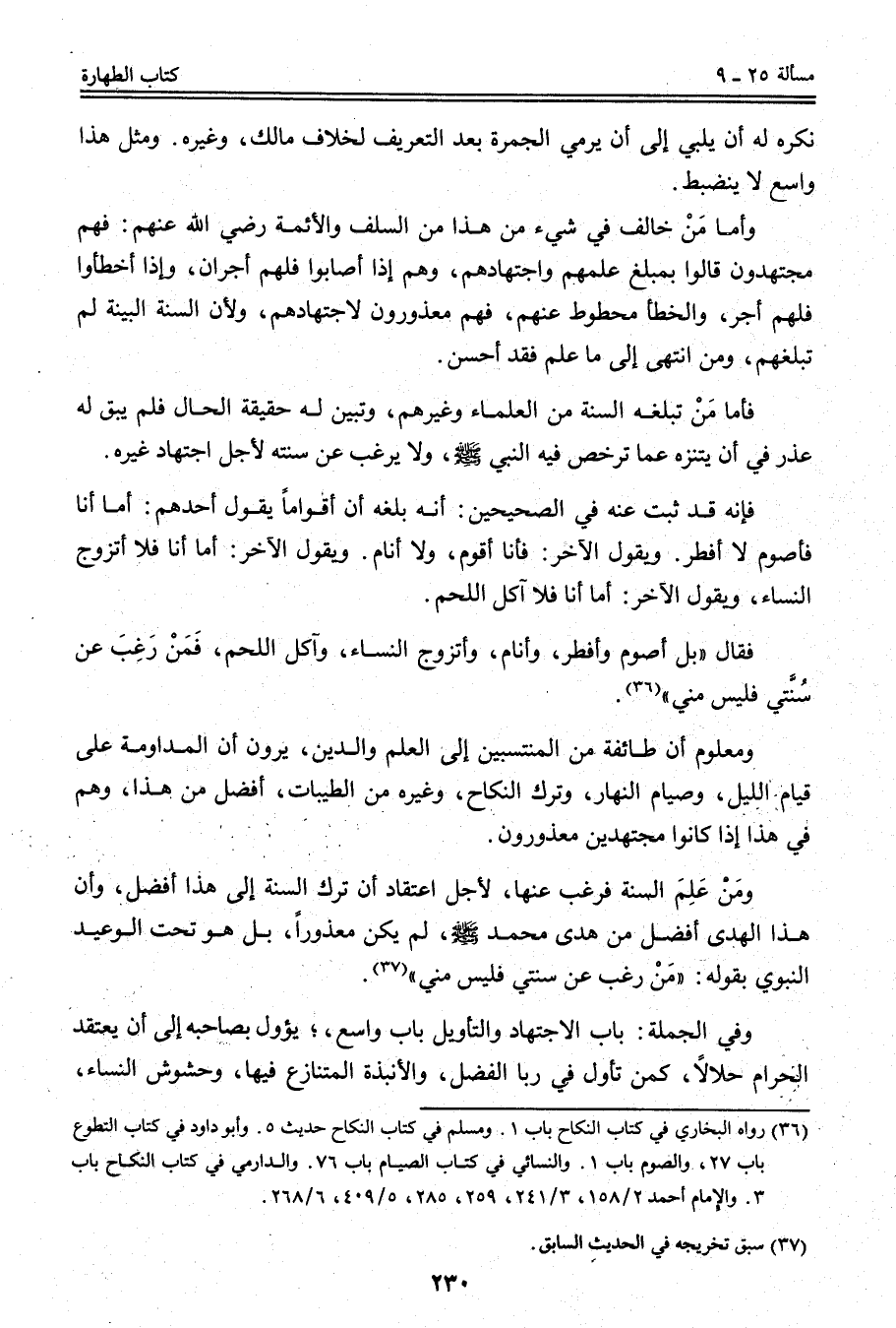 فَأَمَّا مِنْ تَبْلُغُهُ السُّنَّةُ مِنْ الْعُلَمَاءِ وَغَيْرِهِمْ، وَتَبَيَّنَ لَهُ حَقِيقَةُ الْحَالِ فَلَمْ يَبْقَ لَهُ عُذْرٌ فِي أَنْ يَتَنَزَّهَ عَمَّا تَرَخَّصَ فِيهِ النَّبِيُّ - صَلَّى اللَّهُ عَلَيْهِ وَسَلَّمَ - وَلَا يَرْغَبُ عَنْ سُنَّتِهِ لِأَجْلِ اجْتِهَادِ غَيْرِهِ. فَإِنَّهُ قَدْ ثَبَتَ عَنْهُ فِي الصَّحِيحَيْنِ: «أَنَّهُ بَلَغَهُ أَنَّ أَقْوَامًا يَقُولُ أَحَدُهُمْ: أَمَّا أَنَا فَأَصُومُ لَا أُفْطِرُ، وَيَقُولُ الْآخَرُ: فَأَنَا أَقُومُ، وَلَا أَنَامُ، وَيَقُولُ الْآخَرُ: أَمَّا أَنَا فَلَا أَتَزَوَّجُ النِّسَاءَ، وَيَقُولُ الْآخَرُ: أَمَّا أَنَا فَلَا آكُلُ اللَّحْمَ. فَقَالَ بَلْ أَصُومُ وَأُفْطِرُ، وَأَنَامُ، وَأَتَزَوَّجُ النِّسَاءَ، وَآكُلُ اللَّحْمَ، فَمَنْ رَغِبَ عَنْ سُنَّتِي فَلَيْسَ مِنِّي» .