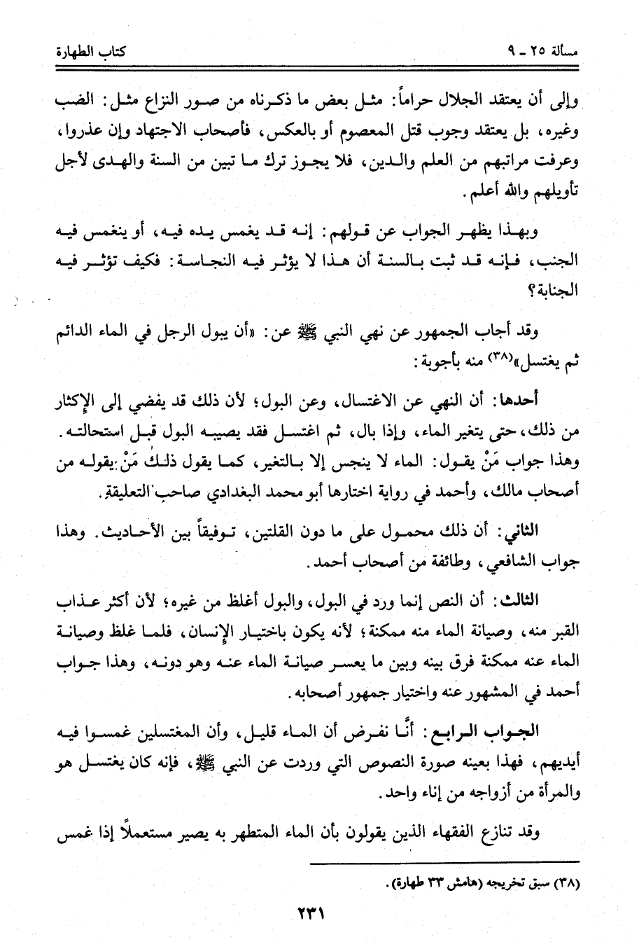 وَبِهَذَا يَظْهَرُ الْجَوَابُ عَنْ قَوْلِهِمْ: إنَّهُ قَدْ يَغْمِسُ يَدَهُ فِيهِ، أَوْ يَنْغَمِسُ فِيهِ الْجُنُبُ، فَإِنَّهُ قَدْ ثَبَتَ بِالسُّنَّةِ أَنَّ هَذَا لَا تُؤَثِّرُ فِيهِ النَّجَاسَةُ: فَكَيْفَ تُؤَثِّرُ فِيهِ الْجَنَابَةُ؟ وَقَدْ أَجَابَ الْجُمْهُورُ عَنْ نَهْيِ النَّبِيِّ - صَلَّى اللَّهُ عَلَيْهِ وَسَلَّمَ - عَنْ: " أَنْ يَبُولَ الرَّجُلُ فِي الْمَاءِ الدَّائِمِ ثُمَّ يَغْتَسِلُ مِنْهُ " بِأَجْوِبَةٍ. أَحَدُهَا: أَنَّ النَّهْيَ عَنْ الِاغْتِسَالِ، وَعَنْ الْبَوْلِ؛ لِأَنَّ ذَلِكَ قَدْ يُفْضِي إلَى الْإِكْثَارِ مِنْ ذَلِكَ، حَتَّى يَتَغَيَّرَ الْمَاءُ، وَإِذَا بَالَ، ثُمَّ اغْتَسَلَ فَقَدْ يُصِيبُهُ الْبَوْلُ قَبْلَ اسْتِحَالَتِهِ. وَهَذَا جَوَابُ مَنْ يَقُولُ: الْمَاءُ لَا يُنَجَّسُ إلَّا بِالتَّغَيُّرِ، كَمَا يَقُولُ ذَلِكَ مَنْ يَقُولُهُ مِنْ أَصْحَابِ مَالِكٍ، وَأَحْمَدَ فِي رِوَايَةٍ اخْتَارَهَا أَبُو مُحَمَّدٍ الْبَغْدَادِيُّ صَاحِبُ التَّعْلِيقَةِ. الثَّانِي: أَنَّ ذَلِكَ مَحْمُولٌ عَلَى مَا دُونَ الْقُلَّتَيْنِ، تَوْفِيقًا بَيْنَ الْأَحَادِيثِ. وَهَذَا جَوَابُ الشَّافِعِيِّ، وَطَائِفَةٍ مِنْ أَصْحَابِ أَحْمَدَ.