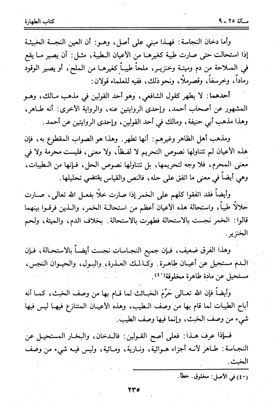 وَأَمَّا دُخَانُ النَّجَاسَةِ: فَهَذَا مَبْنِيٌّ عَلَى أَصْلٍ، وَهُوَ: أَنَّ الْعَيْنَ النَّجِسَةَ الْخَبِيثَةَ إذَا اسْتَحَالَتْ حَتَّى صَارَتْ طَيِّبَةً كَغَيْرِهَا مِنْ الْأَعْيَانِ الطَّيِّبَةِ، مِثْلَ: أَنْ يَصِيرَ مَا يَقَعُ فِي الْمَلَّاحَةِ مِنْ دَمٍ وَمَيْتَةٍ وَخِنْزِيرٍ، مِلْحًا طَيِّبًا كَغَيْرِهَا مِنْ الْمِلْحِ، أَوْ يَصِيرَ الْوُقُودُ رَمَادًا، وَخُرْسَفًا، وقصرملا، وَنَحْوَ ذَلِكَ، فَفِيهِ لِلْعُلَمَاءِ قَوْلَانِ. أَحَدُهُمَا: لَا يَطْهُرُ كَقَوْلِ الشَّافِعِيِّ، وَهُوَ أَحَدُ الْقَوْلَيْنِ فِي مَذْهَبِ مَالِكٍ، وَهُوَ الْمَشْهُورُ عَنْ أَصْحَابِ أَحْمَدَ، وَإِحْدَى الرِّوَايَتَيْنِ عَنْهُ، وَالرِّوَايَةُ الْأُخْرَى: أَنَّهُ طَاهِرٌ، وَهَذَا مَذْهَبُ أَبِي حَنِيفَةَ، وَمَالِكٍ فِي أَحَدِ الْقَوْلَيْنِ، وَإِحْدَى الرِّوَايَتَيْنِ عَنْ أَحْمَدَ. وَمَذْهَبُ أَهْلِ الظَّاهِرِ وَغَيْرِهِمْ: أَنَّهَا تَطْهُرُ، وَهَذَا هُوَ الصَّوَابُ الْمَقْطُوعُ بِهِ، فَإِنَّ هَذِهِ الْأَعْيَانَ لَمْ تَتَنَاوَلُهَا نُصُوصُ التَّحْرِيمِ لَا لَفْظًا، وَلَا مَعْنًى، فَلَيْسَتْ مُحَرَّمَةً وَلَا فِي مَعْنَى الْمُحَرَّمِ، فَلَا وَجْهَ لِتَحْرِيمِهَا، بَلْ تَتَنَاوَلُهَا نُصُوصُ الْحِلِّ، فَإِنَّهَا مِنْ الطَّيِّبَاتِ، وَهِيَ أَيْضًا فِي مَعْنَى مَا اُتُّفِقَ عَلَى حِلِّهِ، فَالنَّصُّ وَالْقِيَاسُ يَقْتَضِي تَحْلِيلَهَا.