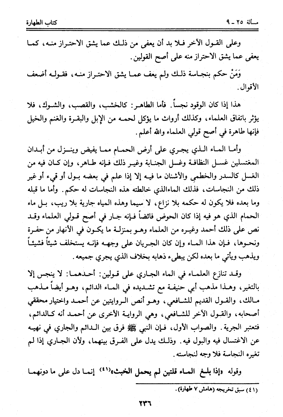 وَقَدْ تَنَازَعَ الْعُلَمَاءُ فِي الْمَاءِ الْجَارِي عَلَى قَوْلَيْنِ. أَحَدُهُمَا: لَا يَنْجُسُ إلَّا بِالتَّغَيُّرِ، وَهَذَا مَذْهَبُ أَبِي حَنِيفَةَ مَعَ تَشْدِيدِهِ فِي الْمَاءِ الدَّائِمِ، وَهُوَ أَيْضًا مَذْهَبُ مَالِكٍ، وَالْقَوْلُ الْقَدِيمُ لِلشَّافِعِيِّ، وَهُوَ أَنَصُّ الرِّوَايَتَيْنِ عَنْ أَحْمَدَ وَاخْتِيَارُ مُحَقِّقِي أَصْحَابِهِ، وَالْقَوْلُ الْآخَرُ لِلشَّافِعِيِّ، وَهِيَ الرِّوَايَةُ الْأُخْرَى عَنْ أَحْمَدَ أَنَّهُ كَالدَّائِمِ، فَتُعْتَبَرُ الْجِرْيَةُ، وَالصَّوَابُ الْأَوَّلُ، فَإِنَّ النَّبِيَّ - صَلَّى اللَّهُ عَلَيْهِ وَسَلَّمَ - فَرَّقَ بَيْنَ الدَّائِمِ وَالْجَارِي فِي نَهْيِهِ عَنْ الِاغْتِسَالِ فِيهِ وَالْبَوْلِ فِيهِ، وَذَلِكَ يَدُلُّ عَلَى الْفَرْقِ بَيْنَهُمَا؛ وَلِأَنَّ الْجَارِيَ إذَا لَمْ تُغَيِّرْهُ النَّجَاسَةُ فَلَا وَجْهَ لِنَجَاسَتِهِ. وَقَوْلُهُ «إذَا بَلَغَ الْمَاءُ قُلَّتَيْنِ لَمْ يَحْمِلْ الْخَبَثَ» .