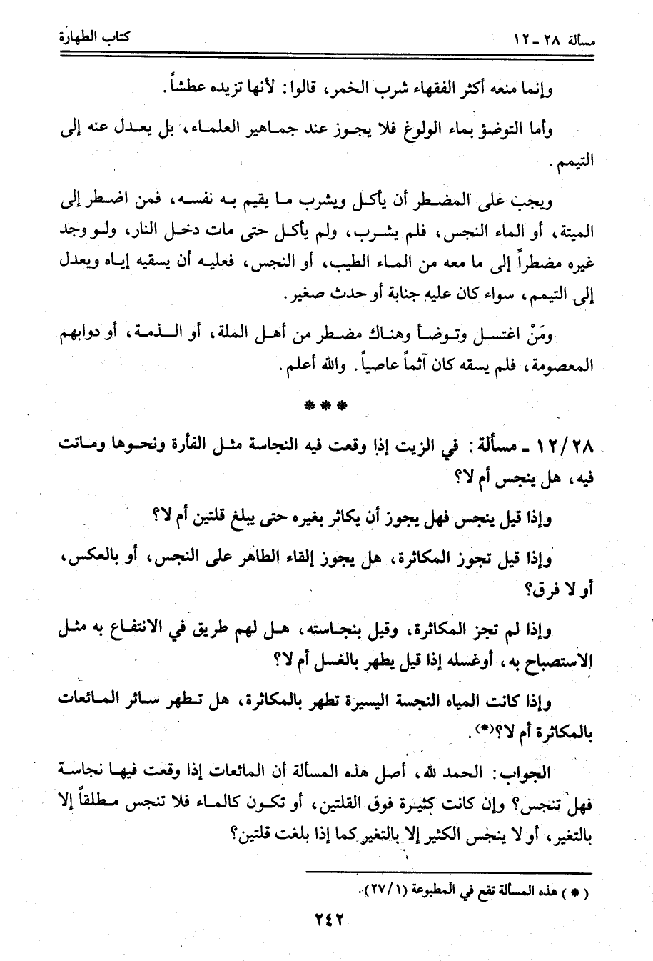 الْجَوَابُ: الْحَمْدُ لِلَّهِ، أَصْلُ هَذِهِ الْمَسْأَلَةِ أَنَّ الْمَائِعَاتِ إذَا وَقَعَتْ فِيهَا نَجَاسَةٌ فَهَلْ تَنْجُسُ؟ وَإِنْ كَانَتْ كَثِيرَةً فَوْقَ الْقُلَّتَيْنِ، أَوْ تَكُونُ كَالْمَاءِ فَلَا تَنْجُسُ مُطْلَقًا إلَّا بِالتَّغَيُّرِ، أَوْ لَا يَنْجُسُ الْكَثِيرُ إلَّا بِالتَّغَيُّرِ كَمَا إذَا بَلَغَتْ قُلَّتَيْنِ؟