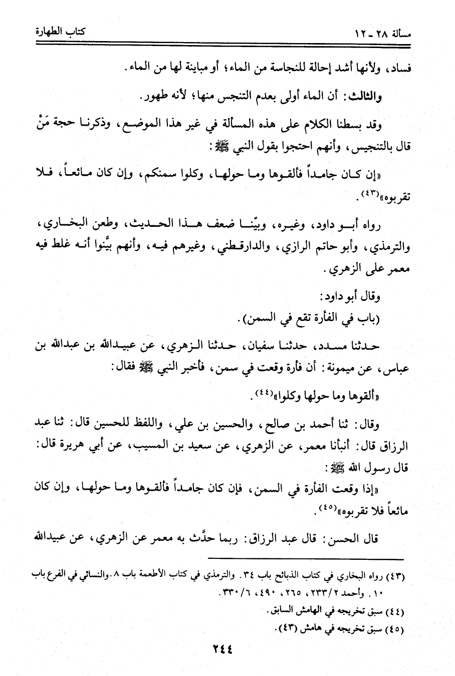 وَقَالَ أَبُو دَاوُد: (بَابٌ فِي الْفَأْرَةِ تَقَعُ فِي السَّمْنِ) . حَدَّثَنَا مُسَدَّدٌ، حَدَّثَنَا سُفْيَانُ، حَدَّثَنَا الزُّهْرِيُّ، عَنْ عُبَيْدِ اللَّهِ بْنِ عَبْدِ اللَّهِ بْنِ عَبَّاسٍ، عَنْ مَيْمُونَةَ: «أَنَّ فَأْرَةً وَقَعَتْ فِي سَمْنٍ، فَأُخْبِرَ النَّبِيُّ - صَلَّى اللَّهُ عَلَيْهِ وَسَلَّمَ - فَقَالَ: أَلْقُوهَا وَمَا حَوْلَهَا وَكُلُوا» . وَقَالَ: ثَنَا أَحْمَدُ بْنُ صَالِحٍ، وَالْحُسَيْنُ بْنُ عَلِيٍّ، وَاللَّفْظُ لِلْحُسَيْنِ قَالَ: ثَنَا عَبْدُ الرَّزَّاقِ قَالَ: أَنْبَأَنَا مَعْمَرٌ، عَنْ الزُّهْرِيِّ، عَنْ سَعِيدِ بْنِ الْمُسَيِّبِ، عَنْ أَبِي هُرَيْرَةَ قَالَ: «قَالَ رَسُولُ اللَّهِ - صَلَّى اللَّهُ عَلَيْهِ وَسَلَّمَ -: إذَا وَقَعَتْ الْفَأْرَةُ فِي السَّمْنِ، فَإِنْ كَانَ جَامِدًا فَأَلْقُوهَا وَمَا حَوْلَهَا، وَإِنْ كَانَ مَائِعًا فَلَا تَقْرَبُوهُ» . قَالَ الْحَسَنُ: قَالَ عَبْدُ الرَّزَّاقِ: رُبَّمَا حَدَّثَ بِهِ مَعْمَرٌ عَنْ الزُّهْرِيِّ، عَنْ عُبَيْدِ اللَّهِ بْنِ عَبْدِ اللَّهِ بْنِ عَبَّاسٍ،