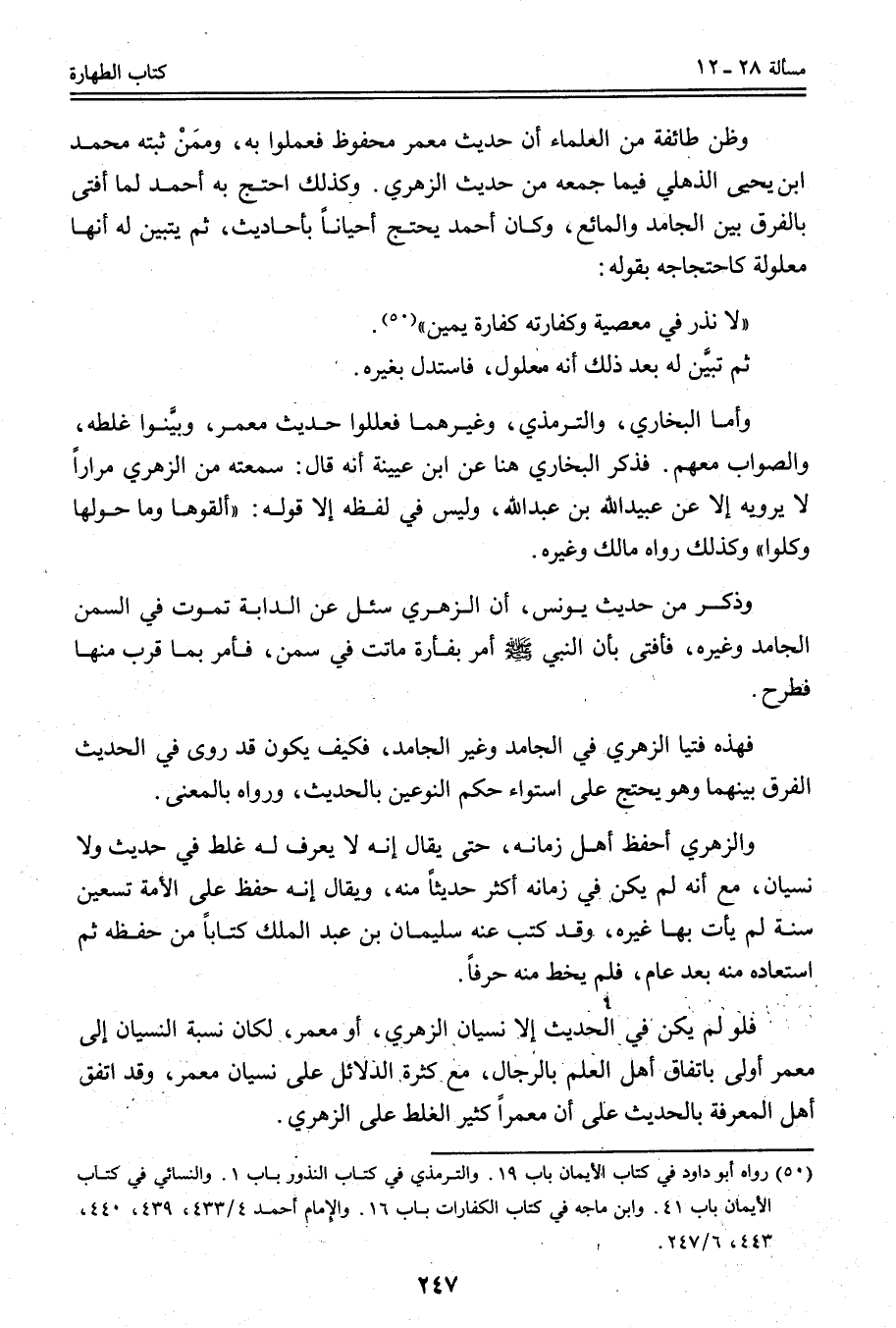 فَهَذِهِ فُتْيَا الزُّهْرِيِّ فِي الْجَامِدِ وَغَيْرِ الْجَامِدِ، فَكَيْفَ يَكُونُ قَدْ رَوَى فِي الْحَدِيثِ الْفَرْقَ بَيْنَهُمَا وَهُوَ يَحْتَجُّ عَلَى اسْتِوَاءِ حُكْمِ النَّوْعَيْنِ بِالْحَدِيثِ، وَرَوَاهُ بِالْمَعْنَى. وَالزُّهْرِيُّ أَحْفَظُ أَهْلِ زَمَانِهِ، حَتَّى يُقَالَ إنَّهُ لَا يُعْرَفُ لَهُ غَلَطٌ فِي حَدِيثٍ وَلَا نِسْيَانٌ، مَعَ أَنَّهُ لَمْ يَكُنْ فِي زَمَانِهِ أَكْثَرُ حَدِيثًا مِنْهُ، وَيُقَالُ إنَّهُ حَفِظَ عَلَى الْأُمَّةِ تِسْعِينَ سُنَّةً لَمْ يَأْتِ بِهَا غَيْرُهُ، وَقَدْ كَتَبَ عَنْهُ سُلَيْمَانُ بْنُ عَبْدِ الْمَلِكِ كِتَابًا مِنْ حِفْظِهِ ثُمَّ اسْتَعَادَهُ مِنْهُ بَعْدَ عَامٍ، فَلَمْ يُخْطِئْ مِنْهُ حَرْفًا