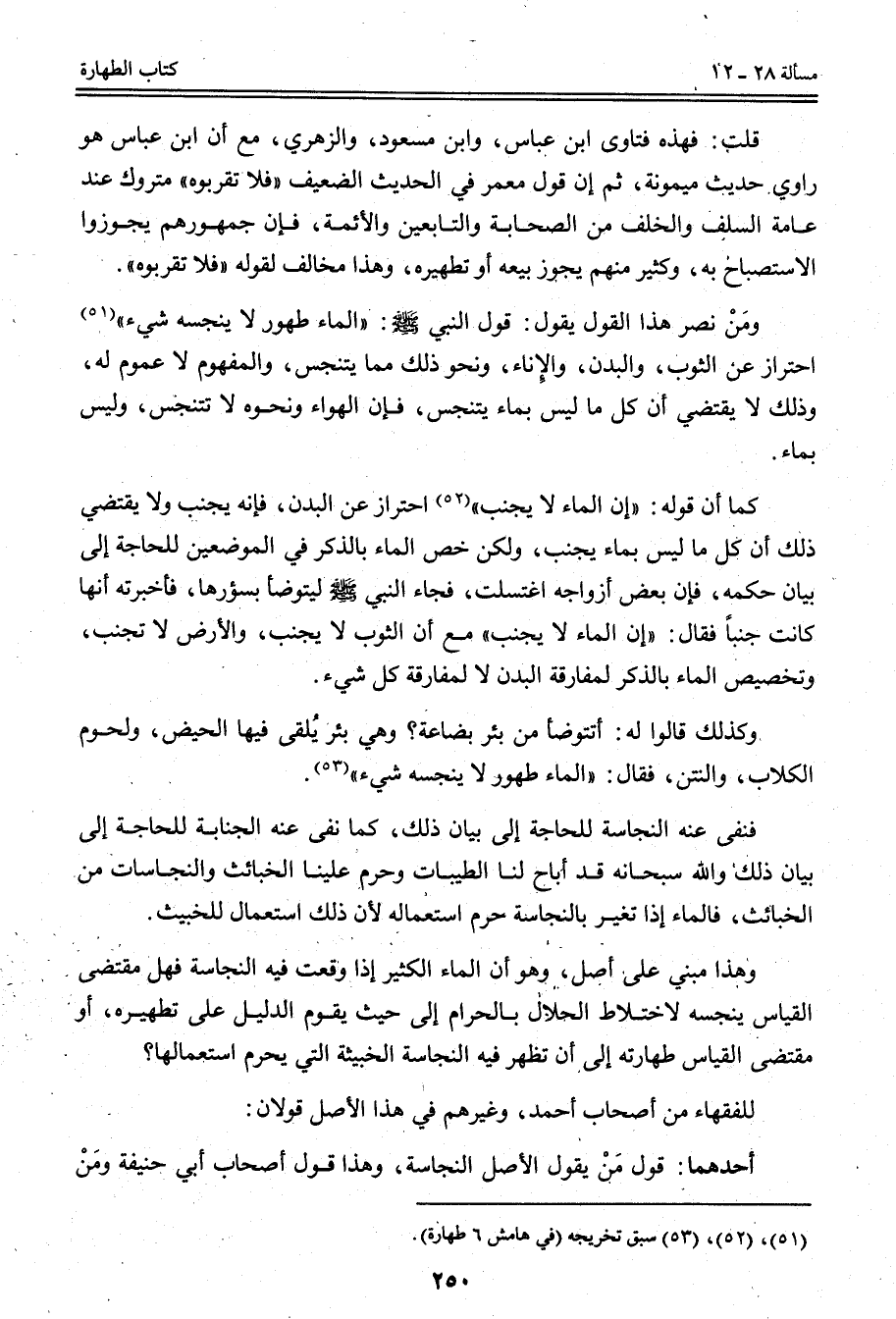 فَنَفَى عَنْهُ النَّجَاسَةَ لِلْحَاجَةِ إلَى بَيَانِ ذَلِكَ، كَمَا نَفَى عَنْهُ الْجَنَابَةَ لِلْحَاجَةِ إلَى بَيَانِ ذَلِكَ وَاَللَّهُ سُبْحَانَهُ قَدْ أَبَاحَ لَنَا الطَّيِّبَاتِ وَحَرَّمَ عَلَيْنَا الْخَبَائِثَ، وَالنَّجَاسَاتُ مِنْ الْخَبَائِثِ، فَالْمَاءُ إذَا تَغَيَّرَ بِالنَّجَاسَةِ حَرُمَ اسْتِعْمَالُهُ؛ لِأَنَّ ذَلِكَ اسْتِعْمَالٌ لِلْخَبِيثِ، وَهَذَا مَبْنِيٌّ عَلَى أَصْلٍ، وَهُوَ أَنَّ الْمَاءَ الْكَثِيرَ إذَا وَقَعَتْ فِيهِ النَّجَاسَةُ فَهَلْ مُقْتَضَى الْقِيَاسِ يُنَجِّسُهُ لِاخْتِلَاطِ الْحَلَالِ بِالْحَرَامِ إلَى حَيْثُ يَقُومُ الدَّلِيلُ عَلَى تَطْهِيرِهِ، أَوْ مُقْتَضَى الْقِيَاسِ طَهَارَتُهُ إلَى أَنْ تَظْهَرَ فِيهِ النَّجَاسَةُ الْخَبِيثَةُ الَّتِي يَحْرُمُ اسْتِعْمَالُهَا؟ لِلْفُقَهَاءِ مِنْ أَصْحَابِ أَحْمَدَ، وَغَيْرِهِمْ فِي هَذَا الْأَصْلِ قَوْلَانِ: أَحَدُهُمَا: قَوْلُ مَنْ يَقُولُ الْأَصْلُ النَّجَاسَةُ، وَهَذَا قَوْلُ أَصْحَابِ أَبِي حَنِيفَةَ وَمَنْ