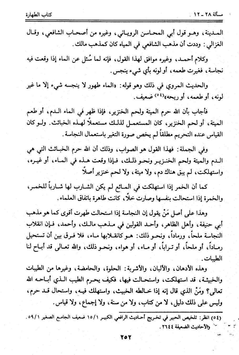 فَأَجَابَ بِأَنَّ اللَّهَ حَرَّمَ الْمَيْتَةَ وَلَحْمَ الْخِنْزِيرِ، فَإِذَا ظَهَرَ فِي الْمَاءِ الدَّمُ، أَوْ طَعْمُ الْمَيْتَةِ أَوْ لَحْمُ الْخِنْزِيرِ، كَانَ الْمُسْتَعْمِلُ لِذَلِكَ مُسْتَعْمِلًا لِهَذِهِ الْخَبَائِثِ. وَلَوْ كَانَ الْقِيَاسُ عِنْدَهُ التَّحْرِيمُ مُطْلَقًا لَمْ يَخُصَّ صُورَةَ التَّغَيُّرِ بِاسْتِعْمَالِ النَّجَاسَةِ. وَفِي الْجُمْلَةِ: فَهَذَا الْقَوْلُ هُوَ الصَّوَابُ، وَذَلِكَ أَنَّ اللَّهَ حَرَّمَ الْخَبَائِثَ الَّتِي هِيَ الدَّمُ وَالْمَيْتَةُ وَلَحْمُ الْخِنْزِيرِ وَنَحْوُ ذَلِكَ، فَإِذَا وَقَعَتْ هَذِهِ فِي الْمَاءِ، أَوْ غَيْرِهِ، وَاسْتُهْلِكَتْ، لَمْ يَبْقَ هُنَاكَ دَمٌ، وَلَا مَيْتَةٌ، وَلَا لَحْمُ خِنْزِيرٍ أَصْلًا كَمَا أَنَّ الْخَمْرَ إذَا اُسْتُهْلِكَتْ فِي الْمَائِعِ لَمْ يَكُنْ الشَّارِبُ لَهَا شَارِبًا لِلْخَمْرِ، وَالْخَمْرَةُ إذَا اسْتَحَالَتْ بِنَفْسِهَا وَصَارَتْ خَلًّا، كَانَتْ طَاهِرَةً بِاتِّفَاقِ الْعُلَمَاءِ، وَهَذَا عَلَى أَصْلِ مَنْ يَقُولُ إنَّ النَّجَاسَةَ إذَا اسْتَحَالَتْ طَهُرَتْ أَقْوَى كَمَا هُوَ مَذْهَبُ أَبِي حَنِيفَةَ، وَأَهْلِ الظَّاهِرِ، وَأَحَدُ الْقَوْلَيْنِ فِي مَذْهَبِ مَالِكٍ، وَأَحْمَدَ، فَإِنَّ انْقِلَابَ النَّجَاسَةِ مِلْحًا، وَرَمَادًا، وَنَحْوَ ذَلِكَ: هُوَ كَانْقِلَابِهَا مَاءً، فَلَا فَرْقَ بَيْنَ أَنْ تَسْتَحِيلَ رَمَادًا، أَوْ مِلْحًا، أَوْ تُرَابًا، أَوْ مَاءً، أَوْ هَوَاءً، وَنَحْوَ ذَلِكَ، وَاَللَّهُ تَعَالَى قَدْ أَبَاحَ لَنَا الطَّيِّبَاتِ، وَهَذِهِ الْأَدْهَانُ، وَالْأَلْبَانُ، وَالْأَشْرِبَةُ: الْحُلْوَةُ، وَالْحَامِضَةُ، وَغَيْرُهَا مِنْ الطَّيِّبَاتِ، وَالْخَبِيثَةُ، قَدْ اُسْتُهْلِكَتْ، وَاسْتَحَالَتْ فِيهَا، فَكَيْفَ يَحْرُمُ الطَّيِّبُ الَّذِي أَبَاحَهُ اللَّهُ تَعَالَى؟ وَمَنْ الَّذِي قَالَ إنَّهُ إذَا خَالَطَهُ الْخَبِيثُ، وَاسْتُهْلِكَ فِيهِ، وَاسْتَحَالَ قَدْ حَرُمَ، وَلَيْسَ عَلَى ذَلِكَ دَلِيلٌ، لَا مِنْ كِتَابٍ، وَلَا مِنْ سُنَّةٍ، وَلَا إجْمَاعٍ، وَلَا قِيَاسٍ.