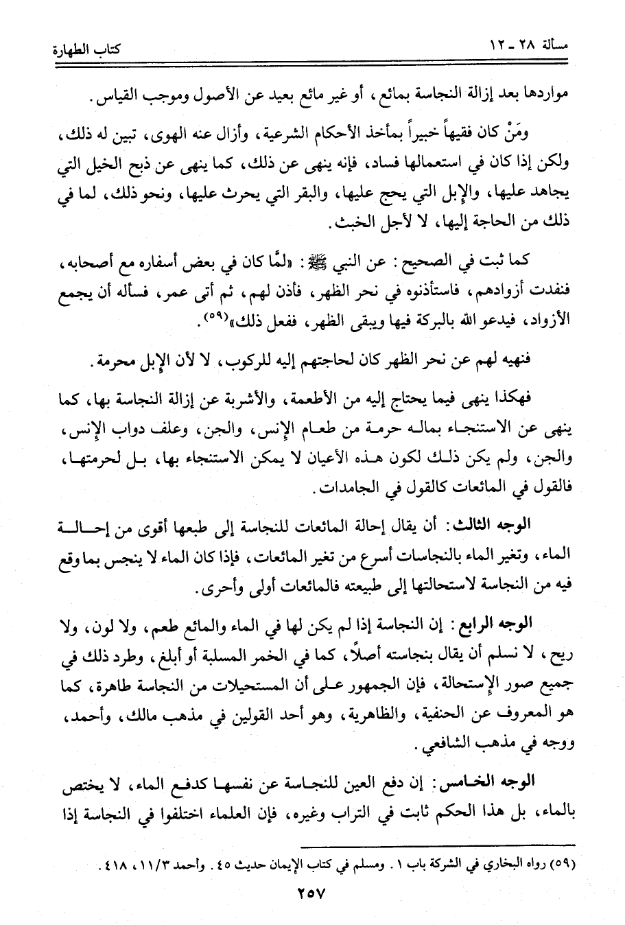 الْوَجْهُ الرَّابِعُ: أَنَّ النَّجَاسَةَ إذَا لَمْ يَكُنْ لَهَا فِي الْمَاءِ وَالْمَائِعِ طَعْمٌ، وَلَا لَوْنٌ، وَلَا رِيحٌ، لَا نُسَلِّمُ أَنْ يُقَالَ بِنَجَاسَتِهِ أَصْلًا، كَمَا فِي الْخَمْرِ الْمُسْلَبَةِ أَوْ أَبْلَغَ، وَطُرِدَ ذَلِكَ فِي جَمِيعِ صُوَرِ الِاسْتِحَالَةِ، فَإِنَّ الْجُمْهُورَ عَلَى أَنَّ الْمُسْتَحِيلَاتِ مِنْ النَّجَاسَةِ طَاهِرَةٌ، كَمَا هُوَ الْمَعْرُوفُ عَنْ الْحَنَفِيَّةِ، وَالظَّاهِرِيَّةِ، وَهُوَ أَحَدُ الْقَوْلَيْنِ فِي مَذْهَبِ مَالِكٍ، وَأَحْمَدَ، وَوَجْهٌ فِي مَذْهَبِ الشَّافِعِيِّ.