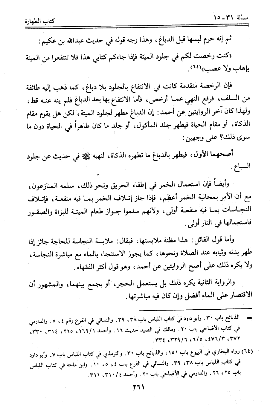 فَإِنَّ الرُّخْصَةَ مُتَقَدِّمَةٌ كَانَتْ فِي الِانْتِفَاعِ بِالْجُلُودِ بِلَا دِبَاغٍ، كَمَا ذَهَبَ إلَيْهِ طَائِفَةٌ مِنْ السَّلَفِ، فَرُفِعَ النَّهْيُ عَمَّا أَرْخَصَ، فَأَمَّا الِانْتِفَاعُ بِهَا بَعْدَ الدِّبَاغِ فَلَمْ يُنْهِ عَنْهُ قَطُّ، وَلِهَذَا كَانَ آخَرُ الرِّوَايَتَيْنِ عَنْ أَحْمَدَ: إنَّ الدِّبَاغَ مُطَهِّرٌ لِجُلُودِ الْمَيْتَةِ، لَكِنْ هَلْ يَقُومُ مَقَامَ الذَّكَاةِ، أَوْ مَقَامَ الْحَيَاةِ فَيَطْهُرُ جِلْدُ الْمَأْكُولِ، أَوْ جِلْدُ مَا كَانَ طَاهِرًا فِي الْحَيَاةِ دُونَ مَا سِوَى ذَلِكَ؟ عَلَى وَجْهَيْنِ: أَصَحُّهُمَا الْأَوَّلُ، فَيَطْهُرُ بِالدِّبَاغِ مَا تُطَهِّرُهُ الذَّكَاةُ، لِنَهْيِهِ - صَلَّى اللَّهُ عَلَيْهِ وَسَلَّمَ - فِي حَدِيثٍ عَنْ جُلُودِ السِّبَاعِ، وَأَيْضًا فَإِنَّ اسْتِعْمَالَ الْخَمْرِ فِي إطْفَاءِ الْحَرِيقِ وَنَحْوِ ذَلِكَ، سَلَّمَهُ الْمُنَازَعُونَ، مَعَ أَنَّ الْأَمْرَ بِمُجَانَبَةِ الْخَمْرِ أَعْظَمُ، فَإِذَا جَازَ إتْلَافُ الْخَمْرِ بِمَا فِيهِ مَنْفَعَةٌ، فَإِتْلَافُ النَّجَاسَاتِ بِمَا فِيهِ مَنْفَعَةٌ أَوْلَى؛ وَلِأَنَّهُمْ سَلَّمُوا جَوَازَ طَعَامِ الْمَيْتَةِ لِلْبُزَاةِ وَالصُّقُورِ فَاسْتِعْمَالُهَا فِي النَّارِ أَوْلَى، وَأَمَّا قَوْلُ الْقَائِلِ: هَذَا مَظِنَّةُ مُلَابَسَتِهَا، فَيُقَالُ: مُلَابَسَةُ النَّجَاسَةِ لِلْحَاجَةِ جَائِزٌ إذَا طَهُرَ بَدَنُهُ وَثِيَابُهُ عِنْدَ الصَّلَاةِ وَنَحْوِهَا، كَمَا يَجُوزُ الِاسْتِنْجَاءُ بِالْمَاءِ مَعَ مُبَاشَرَةِ النَّجَاسَةِ، وَلَا يُكْرَهُ ذَلِكَ عَلَى أَصَحِّ الرِّوَايَتَيْنِ عَنْ أَحْمَدَ، وَهُوَ قَوْلُ أَكْثَرِ الْفُقَهَاءِ. وَالرِّوَايَةُ الثَّانِيَةُ يُكْرَهُ ذَلِكَ بَلْ يَسْتَعْمِلُ الْحَجَرَ، أَوْ يَجْمَعَ بَيْنَهُمَا، وَالْمَشْهُورُ أَنَّ الِاقْتِصَارَ عَلَى الْمَاءِ أَفْضَلُ وَإِنْ كَانَ فِيهِ مُبَاشَرَتُهَا.