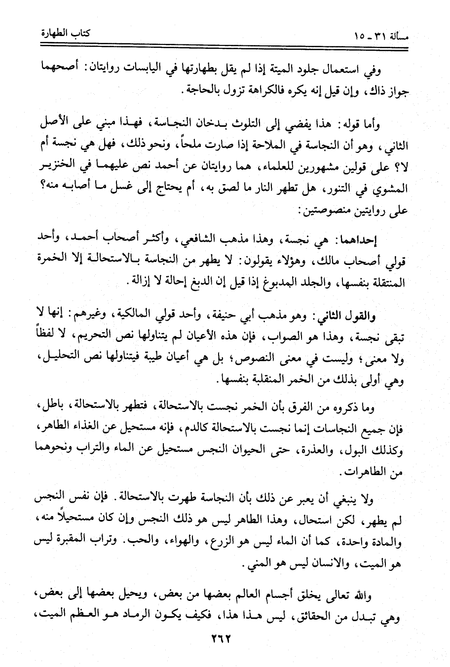 وَالْقَوْلُ الثَّانِي: وَهُوَ مَذْهَبُ أَبِي حَنِيفَةَ، وَأَحَدُ قَوْلَيْ الْمَالِكِيَّةِ، وَغَيْرِهِمْ: إنَّهَا لَا تَبْقَى نَجِسَةٌ، وَهَذَا هُوَ الصَّوَابُ، فَإِنَّ هَذِهِ الْأَعْيَانَ لَمْ يَتَنَاوَلْهَا نَصُّ التَّحْرِيمِ، لَا لَفْظًا وَلَا مَعْنًى؛ وَلَيْسَتْ فِي مَعْنَى النُّصُوصِ؛ بَلْ هِيَ أَعْيَانٌ طَيِّبَةٌ فَيَتَنَاوَلُهَا نَصُّ التَّحْلِيلِ، وَهِيَ أَوْلَى بِذَلِكَ مِنْ الْخَمْرِ الْمُنْقَلِبَةِ بِنَفْسِهَا. وَمَا ذَكَرُوهُ مِنْ الْفَرْقِ بِأَنَّ الْخَمْرَ نُجِّسَتْ بِالِاسْتِحَالَةِ، فَتَطْهُرُ بِالِاسْتِحَالَةِ، بَاطِلٌ، فَإِنَّ جَمِيعَ النَّجَاسَاتِ إنَّمَا نُجِّسَتْ بِالِاسْتِحَالَةِ كَالدَّمِ، فَإِنَّهُ مُسْتَحِيلٌ عَنْ الْغِذَاءِ الطَّاهِرِ، وَكَذَلِكَ الْبَوْلُ وَالْعَذِرَةُ، حَتَّى الْحَيَوَانُ النَّجَسُ مُسْتَحِيلٌ عَنْ الْمَاءِ وَالتُّرَابِ وَنَحْوِهِمَا مِنْ الطَّاهِرَاتِ، وَلَا يَنْبَغِي أَنْ يُعَبِّرَ عَنْ ذَلِكَ بِأَنَّ النَّجَاسَةَ طَهُرَتْ بِالِاسْتِحَالَةِ. فَإِنَّ نَفْسَ النَّجَسِ لَمْ يَطْهُرْ، لَكِنْ اسْتَحَالَ، وَهَذَا الطَّاهِرُ لَيْسَ هُوَ ذَلِكَ النَّجَسُ وَإِنْ كَانَ مُسْتَحِيلًا مِنْهُ، وَالْمَادَّةُ وَاحِدَةٌ، كَمَا أَنَّ الْمَاءَ لَيْسَ هُوَ الزَّرْعُ، وَالْهَوَاءُ، وَالْحَبُّ، وَتُرَابُ الْمَقْبَرَةِ لَيْسَ هُوَ الْمَيِّتُ، وَالْإِنْسَانُ لَيْسَ هُوَ الْمَنِيُّ.