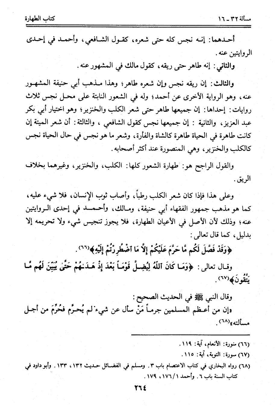 وَالْقَوْلُ الرَّاجِحُ هُوَ: طَهَارَةُ الشُّعُورِ كُلِّهَا: الْكَلْبُ، وَالْخِنْزِيرُ، وَغَيْرُهُمَا بِخِلَافِ الرِّيقِ، وَعَلَى هَذَا فَإِذَا كَانَ شَعْرُ الْكَلْبِ رَطْبًا، وَأَصَابَ ثَوْبَ الْإِنْسَانِ، فَلَا شَيْءَ عَلَيْهِ، كَمَا هُوَ مَذْهَبُ جُمْهُورِ الْفُقَهَاءِ أَبِي حَنِيفَةَ، وَمَالِكٍ، وَأَحْمَدَ فِي إحْدَى الرِّوَايَتَيْنِ عَنْهُ؛ وَذَلِكَ؛ لِأَنَّ الْأَصْلَ فِي الْأَعْيَانِ الطَّهَارَةُ، فَلَا يَجُوزُ تَنْجِيسُ شَيْءٍ وَلَا تَحْرِيمُهُ إلَّا بِدَلِيلٍ، كَمَا قَالَ تَعَالَى: {وَقَدْ فَصَّلَ لَكُمْ مَا حَرَّمَ عَلَيْكُمْ إِلا مَا اضْطُرِرْتُمْ إِلَيْهِ} [الأنعام: 119] ، وَقَالَ تَعَالَى: {وَمَا كَانَ اللَّهُ لِيُضِلَّ قَوْمًا بَعْدَ إِذْ هَدَاهُمْ حَتَّى يُبَيِّنَ لَهُمْ مَا يَتَّقُونَ} [التوبة: 115] ، وَقَالَ النَّبِيُّ - صَلَّى اللَّهُ عَلَيْهِ وَسَلَّمَ - فِي الْحَدِيثِ الصَّحِيحِ: «إنَّ مِنْ أَعْظَمِ الْمُسْلِمِينَ جُرْمًا مَنْ سَأَلَ عَنْ شَيْءٍ لَمْ يُحَرَّمْ فَحُرِّمَ مِنْ أَجْلِ مَسْأَلَتِهِ» .