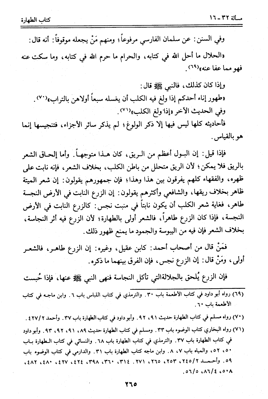 وَفِي السُّنَنِ: عَنْ سَلْمَانَ الْفَارِسِيِّ مَرْفُوعًا؛ وَمِنْهُمْ مَنْ يَجْعَلُهُ مَوْقُوفًا: أَنَّهُ قَالَ: «الْحَلَالُ مَا أَحَلَّ اللَّهُ فِي كِتَابِهِ، وَالْحَرَامُ مَا حَرَّمَ اللَّهُ فِي كِتَابِهِ، وَمَا سَكَتَ عَنْهُ فَهُوَ مِمَّا عَفَا عَنْهُ» . وَإِذَا كَانَ كَذَلِكَ، فَالنَّبِيُّ - صَلَّى اللَّهُ عَلَيْهِ وَسَلَّمَ - قَالَ: «طَهُورُ إنَاءِ أَحَدِكُمْ إذَا وَلَغَ فِيهِ الْكَلْبُ أَنْ يَغْسِلَهُ سَبْعًا أُولَاهُنَّ بِالتُّرَابِ» ، وَفِي الْحَدِيثِ الْآخَرِ «إذَا وَلَغَ الْكَلْبُ» . فَأَحَادِيثُهُ كُلُّهَا لَيْسَ فِيهَا إلَّا ذِكْرُ الْوُلُوغِ؛ لَمْ يَذْكُرْ سَائِرَ الْأَجْزَاءِ، فَتَنْجِيسُهَا إنَّمَا هُوَ بِالْقِيَاسِ. فَإِذَا قِيلَ: إنَّ الْبَوْلَ أَعْظَمُ مِنْ الرِّيقِ، كَانَ هَذَا مُتَوَجِّهًا.