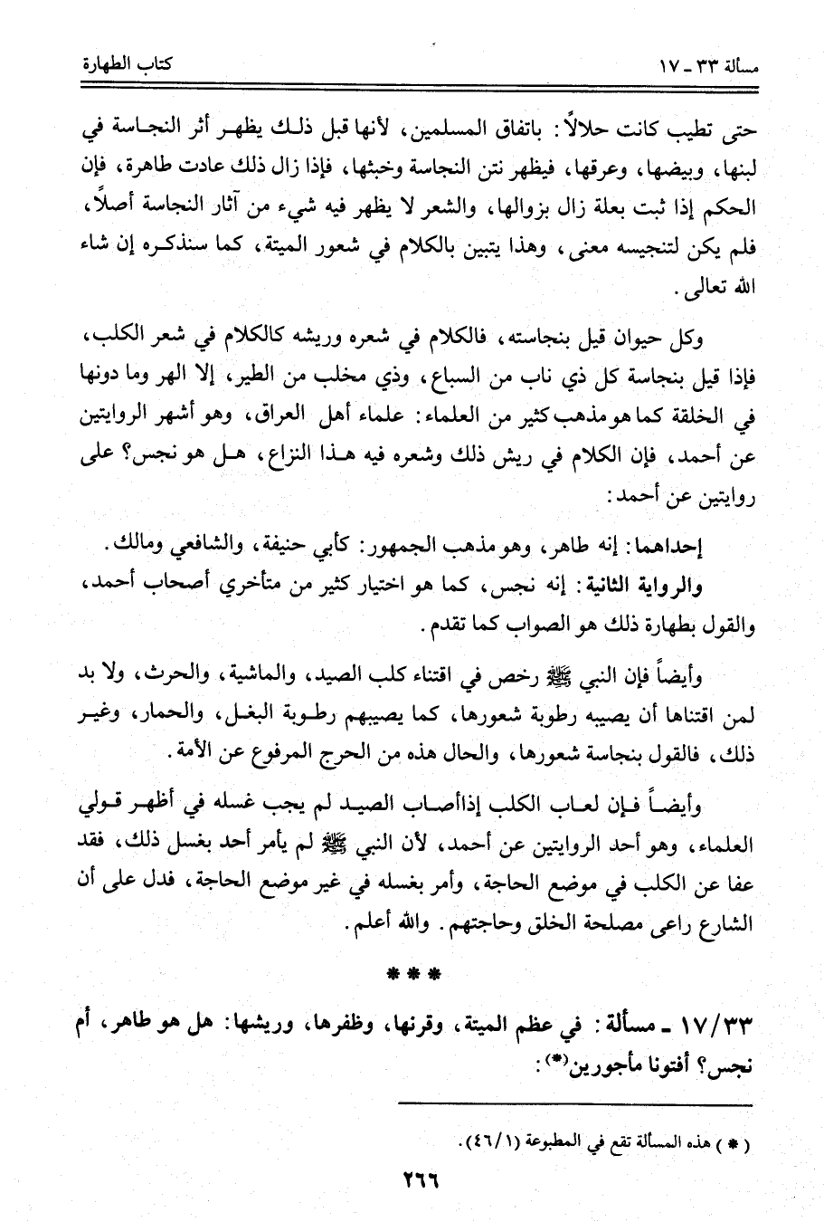 فِي عَظْمِ الْمَيْتَةِ، وَقَرْنِهَا وَظُفُرِهَا، وَرِيشِهَا: هَلْ هُوَ طَاهِرٌ، أَمْ نَجَسٌ؟ أَفْتُونَا مَأْجُورِينَ؟