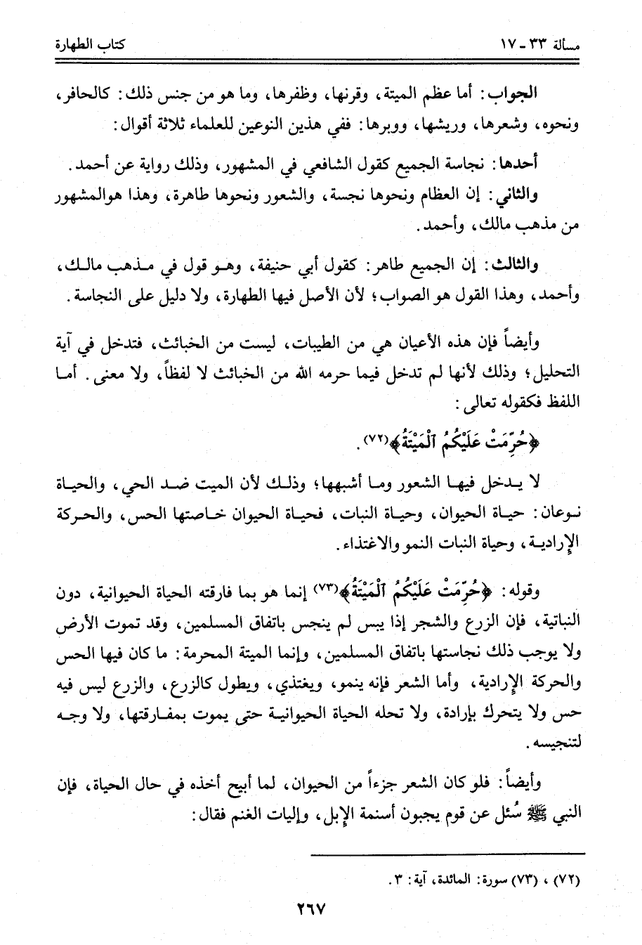 الْجَوَابُ: أَمَّا عَظْمُ الْمَيْتَةِ، وَقَرْنُهَا وَظُفُرُهَا، وَمَا هُوَ مِنْ جِنْسِ ذَلِكَ: كَالْحَافِرِ، وَنَحْوِهِ، وَشَعْرُهَا، وَرِيشُهَا وَوَبَرُهَا: فَفِي هَذَيْنِ النَّوْعَيْنِ لِلْعُلَمَاءِ ثَلَاثَةُ أَقْوَالٍ. أَحَدُهَا: نَجَاسَةُ الْجَمِيعِ كَقَوْلِ الشَّافِعِيِّ فِي الْمَشْهُورِ، وَذَلِكَ رِوَايَةٌ عَنْ أَحْمَدَ، وَالثَّانِي: إنَّ الْعِظَامَ وَنَحْوَهَا نَجِسَةٌ، وَالشُّعُورَ وَنَحْوَهَا طَاهِرَةٌ، وَهَذَا هُوَ الْمَشْهُورُ مِنْ مَذْهَبِ مَالِكٍ، وَأَحْمَدَ.