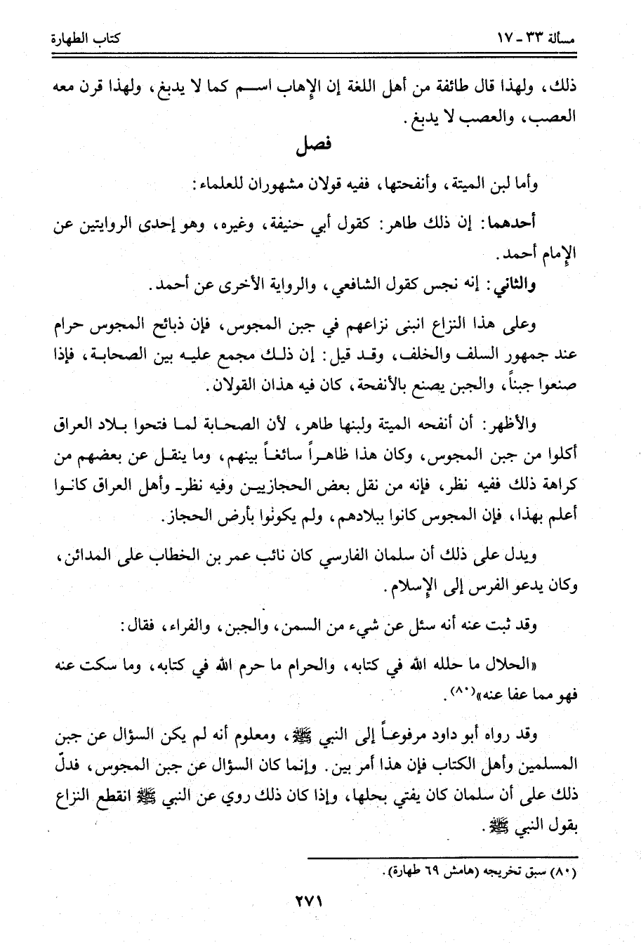 فَصْلٌ وَأَمَّا لَبَنُ الْمَيْتَةِ، وَإِنْفَحَتهَا، فَفِيهِ قَوْلَانِ مَشْهُورَانِ لِلْعُلَمَاءِ: أَحَدُهُمَا: أَنَّ ذَلِكَ طَاهِرٌ: كَقَوْلِ أَبِي حَنِيفَةَ، وَغَيْرِهِ، وَهُوَ إحْدَى الرِّوَايَتَيْنِ عَنْ الْإِمَامِ أَحْمَدَ، وَالثَّانِي: إنَّهُ نَجَسٌ كَقَوْلِ الشَّافِعِيِّ، وَالرِّوَايَةُ الْأُخْرَى عَنْ أَحْمَدَ. وَعَلَى هَذَا النِّزَاعِ انْبَنَى نِزَاعُهُمْ فِي جُبْنِ الْمَجُوسِ، فَإِنَّ ذَبَائِحَ الْمَجُوسِ حَرَامٌ عِنْدَ جُمْهُورِ السَّلَفِ وَالْخَلَفِ، وَقَدْ قِيلَ: إنَّ ذَلِكَ مُجْمَعٌ عَلَيْهِ بَيْنَ الصَّحَابَةِ، فَإِذَا صَنَعُوا جُبْنًا، وَالْجُبْنُ يُصْنَعُ بِالْإِنْفَحَةِ، كَانَ فِيهِ هَذَانِ الْقَوْلَانِ. وَالْأَظْهَرُ: أَنَّ إنْفَحَةَ الْمَيْتَةِ وَلَبَنَهَا طَاهِرٌ؛ لِأَنَّ الصَّحَابَةَ لَمَّا فَتَحُوا بِلَادَ الْعِرَاقِ أَكَلُوا مِنْ جُبْنِ الْمَجُوسِ، وَكَانَ هَذَا ظَاهِرًا سَائِغًا بَيْنَهُمْ، وَمَا يُنْقَلُ عَنْ بَعْضِهِمْ مِنْ كَرَاهَةِ ذَلِكَ فَفِيهِ نَظَرٌ، فَإِنَّهُ مِنْ نَقْلِ بَعْضِ الْحِجَازِيِّينَ وَفِيهِ نَظَرٌ - وَأَهْلُ الْعِرَاقِ كَانُوا أَعْلَمَ بِهَذَا، فَإِنَّ الْمَجُوسَ كَانُوا بِبِلَادِهِمْ، وَلَمْ يَكُونُوا بِأَرْضِ الْحِجَازِ، وَيَدُلُّ عَلَى ذَلِكَ أَنَّ