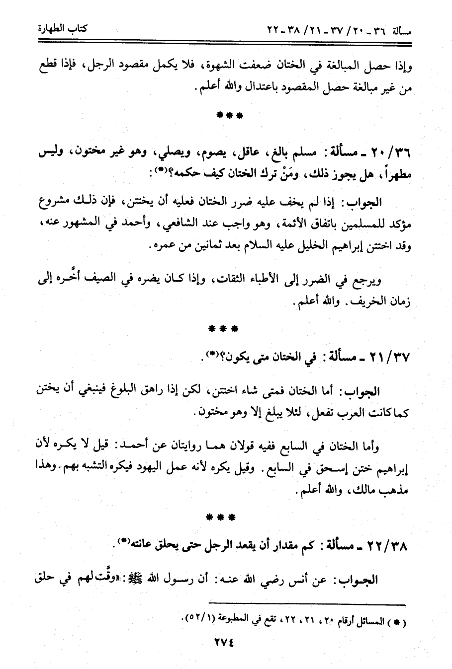 الْجَوَابُ: إذَا لَمْ يَخَفْ عَلَيْهِ ضَرَرَ الْخِتَانِ فَعَلَيْهِ أَنْ يَخْتَتِنَ، فَإِنَّ ذَلِكَ مَشْرُوعٌ مُؤَكَّدٌ لِلْمُسْلِمِينَ بِاتِّفَاقِ الْأَئِمَّةِ، وَهُوَ وَاجِبٌ عِنْدَ الشَّافِعِيِّ، وَأَحْمَدَ فِي الْمَشْهُورِ عَنْهُ، وَقَدْ اخْتَتَنَ إبْرَاهِيمُ الْخَلِيلُ - عَلَيْهِ السَّلَامُ - بَعْدَ ثَمَانِينَ مِنْ عُمُرِهِ، وَيَرْجِعُ فِي الضَّرَرِ إلَى الْأَطِبَّاءِ الثِّقَاتِ، وَإِذَا كَانَ يَضُرُّهُ فِي الصَّيْفِ أَخَّرَهُ إلَى زَمَانِ الْخَرِيفِ، وَاَللَّهُ أَعْلَمُ.
