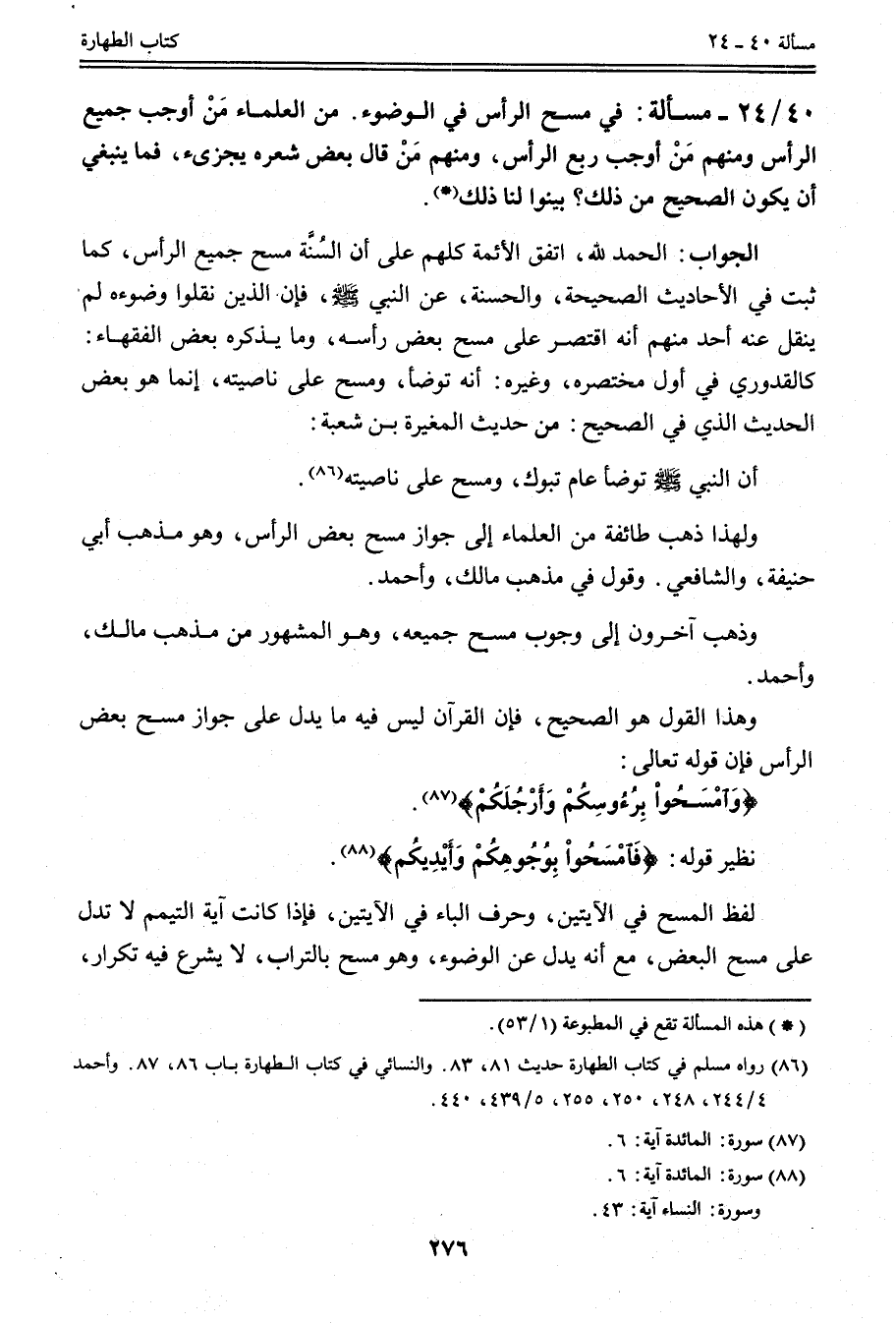 الْجَوَابُ: الْحَمْدُ لِلَّهِ، اتَّفَقَ الْأَئِمَّةُ كُلُّهُمْ عَلَى أَنَّ السُّنَّةَ مَسْحُ جَمِيعِ الرَّأْسِ، كَمَا ثَبَتَ فِي الْأَحَادِيثِ الصَّحِيحَةِ، وَالْحَسَنَةِ، عَنْ النَّبِيِّ - صَلَّى اللَّهُ عَلَيْهِ وَسَلَّمَ - فَإِنَّ الَّذِينَ نَقَلُوا وُضُوءَهُ لَمْ يَنْقُلْ عَنْهُ أَحَدٌ مِنْهُمْ أَنَّهُ اقْتَصَرَ عَلَى مَسْحِ بَعْضِ رَأْسِهِ، وَمَا يَذْكُرُهُ بَعْضُ الْفُقَهَاءِ: كَالْقُدُورِيِّ فِي أَوَّلِ مُخْتَصَرِهِ، وَغَيْرِهِ: أَنَّهُ تَوَضَّأَ، وَمَسَحَ عَلَى نَاصِيَتِهِ، إنَّمَا هُوَ بَعْضُ الْحَدِيثِ الَّذِي فِي الصَّحِيحِ: مِنْ حَدِيثِ الْمُغِيرَةِ بْنِ شُعْبَةَ: «أَنَّ النَّبِيَّ - صَلَّى اللَّهُ عَلَيْهِ وَسَلَّمَ - تَوَضَّأَ عَامَ تَبُوكَ، وَمَسَحَ عَلَى نَاصِيَتِهِ» . وَلِهَذَا ذَهَبَ طَائِفَةٌ مِنْ الْعُلَمَاءِ إلَى جَوَازِ مَسْحِ بَعْضِ الرَّأْسِ، وَهُوَ مَذْهَبُ أَبِي حَنِيفَةَ، وَالشَّافِعِيِّ. وَقَوْلٌ فِي مَذْهَبِ مَالِكٍ، وَأَحْمَدَ، وَذَهَبَ آخَرُونَ إلَى وُجُوبِ مَسْحِ جَمِيعِهِ، وَهُوَ الْمَشْهُورُ مِنْ مَذْهَبِ مَالِكٍ، وَأَحْمَدَ. وَهَذَا الْقَوْلُ هُوَ الصَّحِيحُ، فَإِنَّ الْقُرْآنَ لَيْسَ فِيهِ مَا يَدُلُّ عَلَى جَوَازِ مَسْحِ بَعْضِ الرَّأْسِ فَإِنَّ قَوْله تَعَالَى: {وَامْسَحُوا بِرُءُوسِكُمْ وَأَرْجُلَكُمْ} [المائدة: 6] . نَظِيرُ قَوْلِهِ: {فَامْسَحُوا بِوُجُوهِكُمْ وَأَيْدِيكُمْ} [المائدة: 6] .