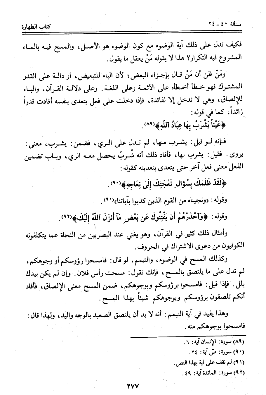 وَأَمْثَالُ ذَلِكَ كَثِيرٌ فِي الْقُرْآنِ، وَهُوَ يُغْنِي عِنْدَ الْبَصْرِيِّينَ مِنْ النُّحَاةِ عَمَّا يَتَكَلَّفُونَهُ الْكُوفِيُّونَ مِنْ دَعْوَى الِاشْتِرَاكِ فِي الْحُرُوفِ، وَكَذَلِكَ الْمَسْحُ فِي الْوُضُوءِ، وَالتَّيَمُّمِ، لَوْ قَالَ: فَامْسَحُوا رُءُوسَكُمْ أَوْ وُجُوهَكُمْ، لَمْ تَدُلَّ عَلَى مَا يَلْتَصِقُ بِالْمَسْحِ، فَإِنَّك تَقُولُ: مَسَحْت رَأْسَ فُلَانٍ. وَإِنْ لَمْ يَكُنْ بِيَدِك بَلَلٌ. فَإِذَا قِيلَ: فَامْسَحُوا بِرُءُوسِكُمْ وَبِوُجُوهِكُمْ، ضَمَّنَ الْمَسْحَ مَعْنَى الْإِلْصَاقِ، فَأَفَادَ أَنَّكُمْ تُلْصِقُونَ بِرُءُوسِكُمْ وَبِوُجُوهِكُمْ شَيْئًا بِهَذَا الْمَسْحِ.