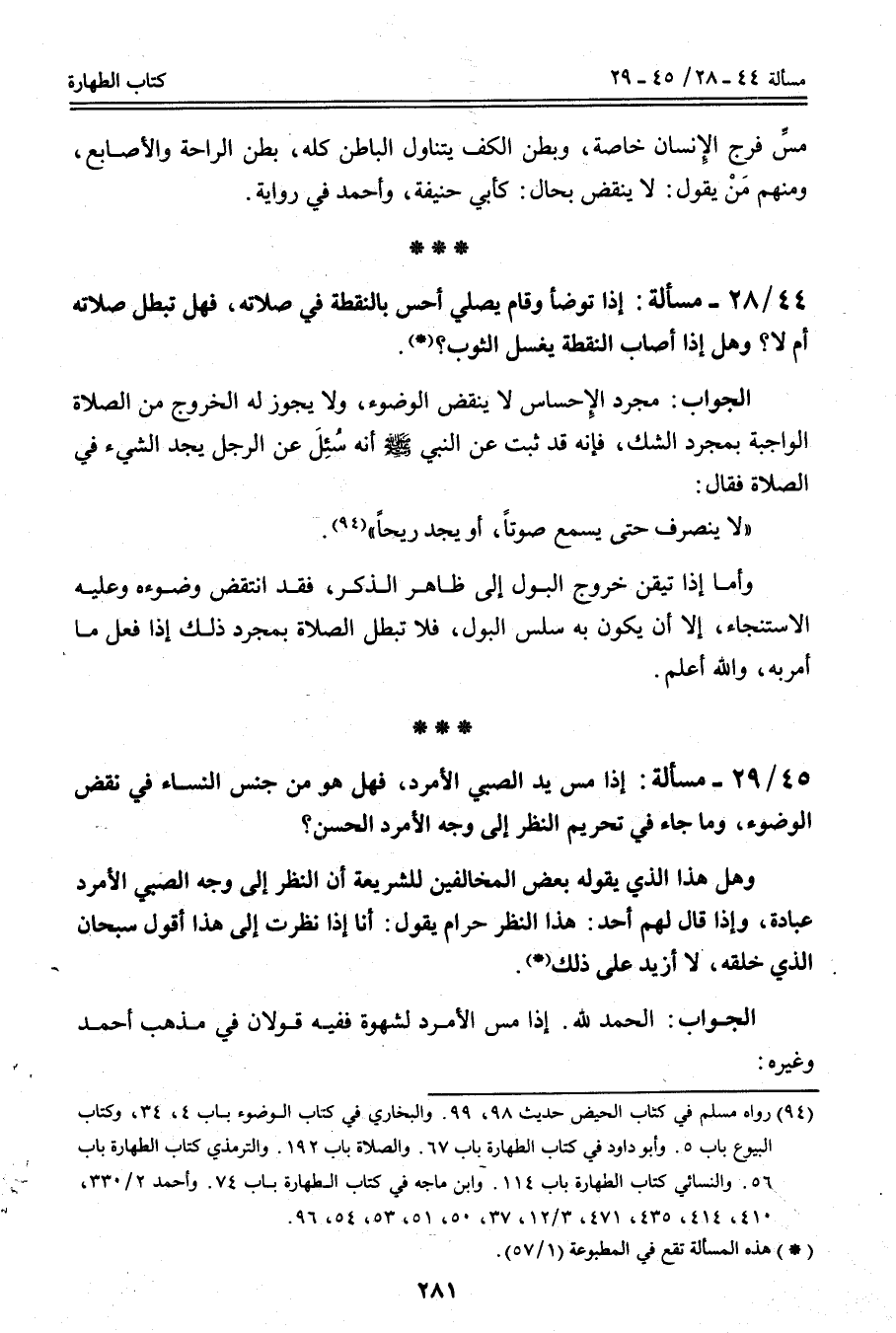 الْجَوَابُ: مُجَرَّدُ الْإِحْسَاسِ لَا يَنْقُضُ الْوُضُوءَ، وَلَا يَجُوزُ لَهُ الْخُرُوجُ مِنْ الصَّلَاةِ الْوَاجِبَةِ بِمُجَرَّدِ الشَّكِّ، فَإِنَّهُ قَدْ ثَبَتَ «عَنْ النَّبِيِّ - صَلَّى اللَّهُ عَلَيْهِ وَسَلَّمَ - أَنَّهُ سُئِلَ عَنْ الرَّجُلِ يَجِدُ الشَّيْءَ فِي الصَّلَاةِ فَقَالَ: لَا يَنْصَرِفُ حَتَّى يَسْمَعَ صَوْتًا، أَوْ يَجِدَ رِيحًا» ، وَأَمَّا إذَا تَيَقَّنَ خُرُوجَ الْبَوْلِ إلَى ظَاهِرِ الذَّكَرَ، فَقَدْ انْتَقَضَ وُضُوءُهُ وَعَلَيْهِ الِاسْتِنْجَاءُ، إلَّا أَنْ يَكُونَ بِهِ سَلَسُ الْبَوْلِ، فَلَا تَبْطُلُ الصَّلَاةُ بِمُجَرَّدِ ذَلِكَ إذَا فَعَلَ مَا أُمِرَ بِهِ، وَاَللَّهُ أَعْلَمُ.