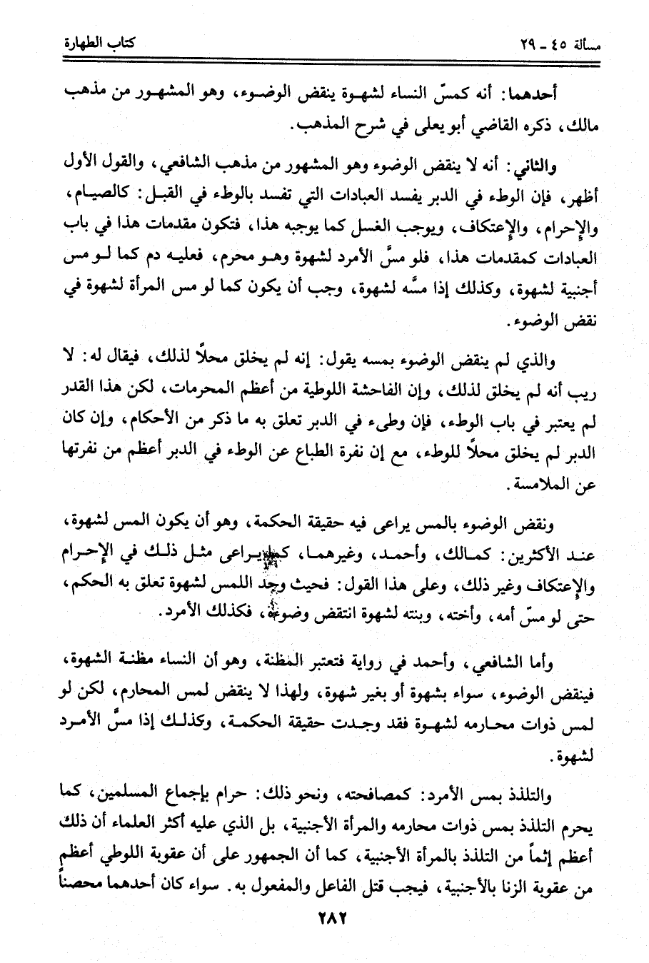 وَالثَّانِي: أَنَّهُ لَا يَنْقُضُ الْوُضُوءَ وَهُوَ الْمَشْهُورُ مِنْ مَذْهَبِ الشَّافِعِيِّ، وَالْقَوْلُ الْأَوَّلُ أَظْهَرُ، فَإِنَّ الْوَطْءَ فِي الدُّبُرِ يُفْسِدُ الْعِبَادَاتِ الَّتِي تَفْسُدُ بِالْوَطْءِ فِي الْقُبُلِ: كَالصِّيَامِ، وَالْإِحْرَامِ، وَالِاعْتِكَافِ، وَيُوجِبُ الْغُسْلَ كَمَا يُوجِبُهُ هَذَا، فَتَكُونُ مُقَدِّمَاتُ هَذَا فِي بَابِ الْعِبَادَاتِ كَمُقَدِّمَاتِ هَذَا، فَلَوْ مَسَّ الْأَمْرَدَ لِشَهْوَةٍ وَهُوَ مُحْرِمٌ، فَعَلَيْهِ دَمٌ كَمَا لَوْ مَسَّ أَجْنَبِيَّةً لِشَهْوَةٍ، وَكَذَلِكَ إذَا مَسَّهُ لِشَهْوَةٍ، وَجَبَ أَنْ يَكُونَ كَمَا لَوْ مَسَّ الْمَرْأَةَ لِشَهْوَةٍ فِي نَقْضِ الْوُضُوءِ. وَاَلَّذِي لَمْ يَنْقُضْ الْوُضُوءَ بِمَسِّهِ يَقُولُ: إنَّهُ لَمْ يُخْلَقْ مَحَلًّا لِذَلِكَ، فَيُقَالُ لَهُ: لَا رَيْبَ أَنَّهُ لَمْ يُخْلَقْ لِذَلِكَ، وَإِنَّ الْفَاحِشَةَ اللُّوطِيَّةَ مِنْ أَعْظَمِ الْمُحَرَّمَاتِ، لَكِنْ هَذَا الْقَدْرُ لَمْ يُعْتَبَرْ فِي بَابِ الْوَطْءِ، فَإِنْ وَطِئَ فِي الدُّبُرِ تَعَلَّقَ بِهِ مَا ذَكَرَ مِنْ الْأَحْكَامِ، وَإِنْ كَانَ الدُّبُرُ لَمْ يُخْلَقْ مَحَلًّا لِلْوَطْءِ، مَعَ أَنَّ نَفْرَةَ الطِّبَاعِ عَنْ الْوَطْءِ فِي الدُّبُرِ أَعْظَمُ مِنْ نَفْرَتِهَا عَنْ الْمُلَامَسَةِ، وَنَقْضُ الْوُضُوءِ بِالْمَسِّ يُرَاعَى فِيهِ حَقِيقَةُ الْحِكْمَةِ، وَهُوَ أَنْ يَكُونَ الْمَسُّ لِشَهْوَةٍ، عِنْدَ الْأَكْثَرِينَ: كَمَالِكٍ، وَأَحْمَدَ، وَغَيْرِهِمَا، كَمَا يُرَاعَى مِثْلُ ذَلِكَ فِي الْإِحْرَامِ وَالِاعْتِكَافِ وَغَيْرِ ذَلِكَ.