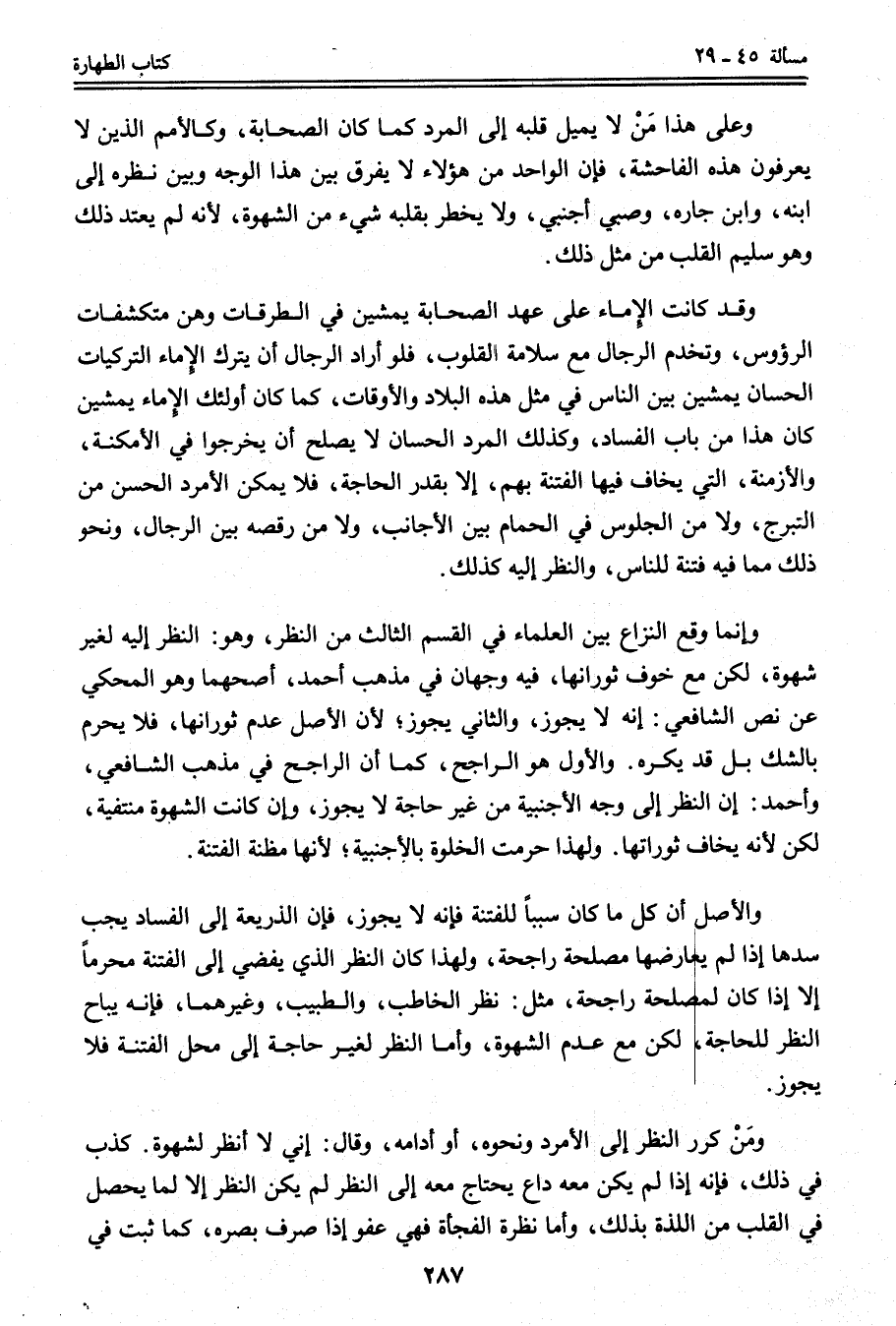 وَقَدْ كَانَتْ الْإِمَاءُ عَلَى عَهْدِ الصَّحَابَةِ يَمْشِينَ فِي الطُّرُقَاتِ وَهُنَّ مُتَكَشِّفَاتِ الرُّءُوسِ، وَتَخْدُمُ الرِّجَالَ مَعَ سَلَامَةِ الْقُلُوبِ، فَلَوْ أَرَادَ الرِّجَالُ أَنْ يَتْرُكَ الْإِمَاءَ التُّرْكِيَّاتِ الْحِسَانَ يَمْشِينَ بَيْنَ النَّاسِ فِي مِثْلِ هَذِهِ الْبِلَادِ وَالْأَوْقَاتِ، كَمَا كَانَ أُولَئِكَ الْإِمَاءُ يَمْشِينَ كَانَ هَذَا مِنْ بَابِ الْفَسَادِ، وَكَذَلِكَ الْمُرْدُ الْحِسَانُ لَا يَصْلُحُ أَنْ يَخْرُجُوا فِي الْأَمْكِنَةِ، وَالْأَزْمِنَةِ، الَّتِي يُخَافُ فِيهَا الْفِتْنَةُ بِهِمْ، إلَّا بِقَدْرِ الْحَاجَةِ، فَلَا يُمَكَّنُ الْأَمْرَدُ الْحَسَنُ مِنْ التَّبَرُّجِ، وَلَا مِنْ الْجُلُوسِ فِي الْحَمَّامِ بَيْنَ الْأَجَانِبِ، وَلَا مِنْ رَقْصَةٍ بَيْنَ الرِّجَالِ، وَنَحْوِ ذَلِكَ مِمَّا فِيهِ فِتْنَةٌ لِلنَّاسِ، وَالنَّظَرُ إلَيْهِ كَذَلِكَ.