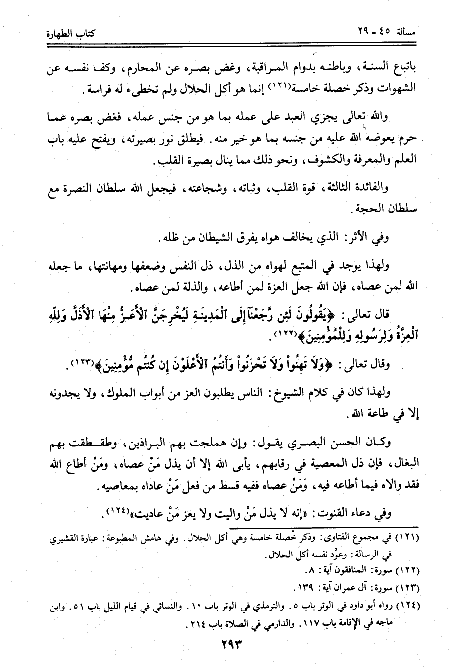 وَالْفَائِدَةُ الثَّالِثَةُ: قُوَّةُ الْقَلْبِ، وَثَبَاتُهُ، وَشَجَاعَتُهُ، فَيَجْعَلُ اللَّهُ سُلْطَانَ النُّصْرَةِ مَعَ سُلْطَانِ الْحُجَّةِ، وَفِي الْأَثَرِ: الَّذِي يُخَالِفُ هَوَاهُ يَفْرُقُ الشَّيْطَانُ مِنْ ظِلِّهِ، وَلِهَذَا يُوجَدُ فِي الْمُتَّبِعِ لِهَوَاهُ مِنْ الذُّلِّ، ذُلِّ النَّفْسِ وَضَعْفِهَا وَمُهَانَتِهَا، مَا جَعَلَهُ اللَّهُ لِمَنْ عَصَاهُ، فَإِنَّ اللَّهَ جَعَلَ الْعِزَّةَ لِمَنْ أَطَاعَهُ، وَالذِّلَّةَ لِمَنْ عَصَاهُ. قَالَ تَعَالَى: {يَقُولُونَ لَئِنْ رَجَعْنَا إِلَى الْمَدِينَةِ لَيُخْرِجَنَّ الأَعَزُّ مِنْهَا الأَذَلَّ وَلِلَّهِ الْعِزَّةُ وَلِرَسُولِهِ وَلِلْمُؤْمِنِينَ} [المنافقون: 8] ، وَقَالَ تَعَالَى: {وَلا تَهِنُوا وَلا تَحْزَنُوا وَأَنْتُمُ الأَعْلَوْنَ إِنْ كُنْتُمْ مُؤْمِنِينَ} [آل عمران: 139] وَلِهَذَا كَانَ فِي كَلَامِ الشُّيُوخِ: النَّاسُ يَطْلُبُونَ الْعِزَّ مِنْ أَبْوَابِ الْمُلُوكِ، وَلَا يَجِدُونَهُ إلَّا فِي طَاعَةِ اللَّهِ.