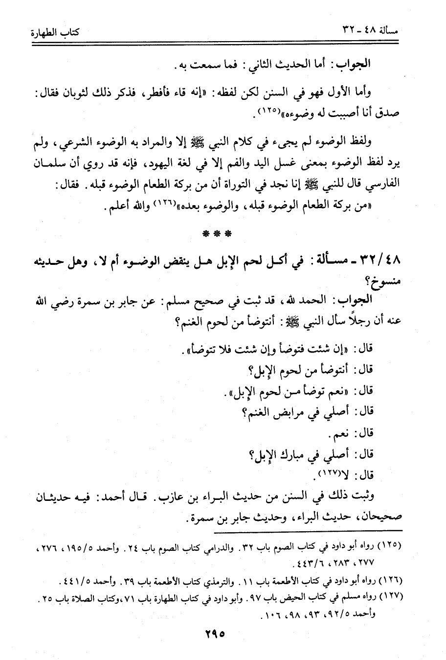 الْجَوَابُ: الْحَمْدُ لِلَّهِ، قَدْ ثَبَتَ فِي صَحِيحِ مُسْلِمٍ: عَنْ جَابِرِ بْنِ سَمُرَةَ - رَضِيَ اللَّهُ عَنْهُ - «أَنَّ رَجُلًا سَأَلَ النَّبِيَّ - صَلَّى اللَّهُ عَلَيْهِ وَسَلَّمَ -: أَنَتَوَضَّأُ مِنْ لُحُومِ الْغَنَمِ؟ قَالَ: إنْ شِئْت فَتَوَضَّأْ وَإِنْ شِئْت فَلَا تَتَوَضَّأْ. قَالَ: أَنَتَوَضَّأُ مِنْ لُحُومِ الْإِبِلِ؟ قَالَ: نَعَمْ تَوَضَّأْ مِنْ لُحُومِ الْإِبِلِ قَالَ: أُصَلِّي فِي مَرَابِضِ الْغَنَمِ؟ قَالَ: نَعَمْ. قَالَ: أُصَلِّي فِي مَبَارِكِ الْإِبِلِ؟ قَالَ: لَا» ، وَثَبَتَ ذَلِكَ فِي السُّنَنِ مِنْ حَدِيثِ الْبَرَاءِ بْنِ عَازِبٍ. قَالَ أَحْمَدُ: فِيهِ حَدِيثَانِ صَحِيحَانِ، حَدِيثُ الْبَرَاءِ، وَحَدِيثُ جَابِرِ بْنِ سَمُرَةَ.